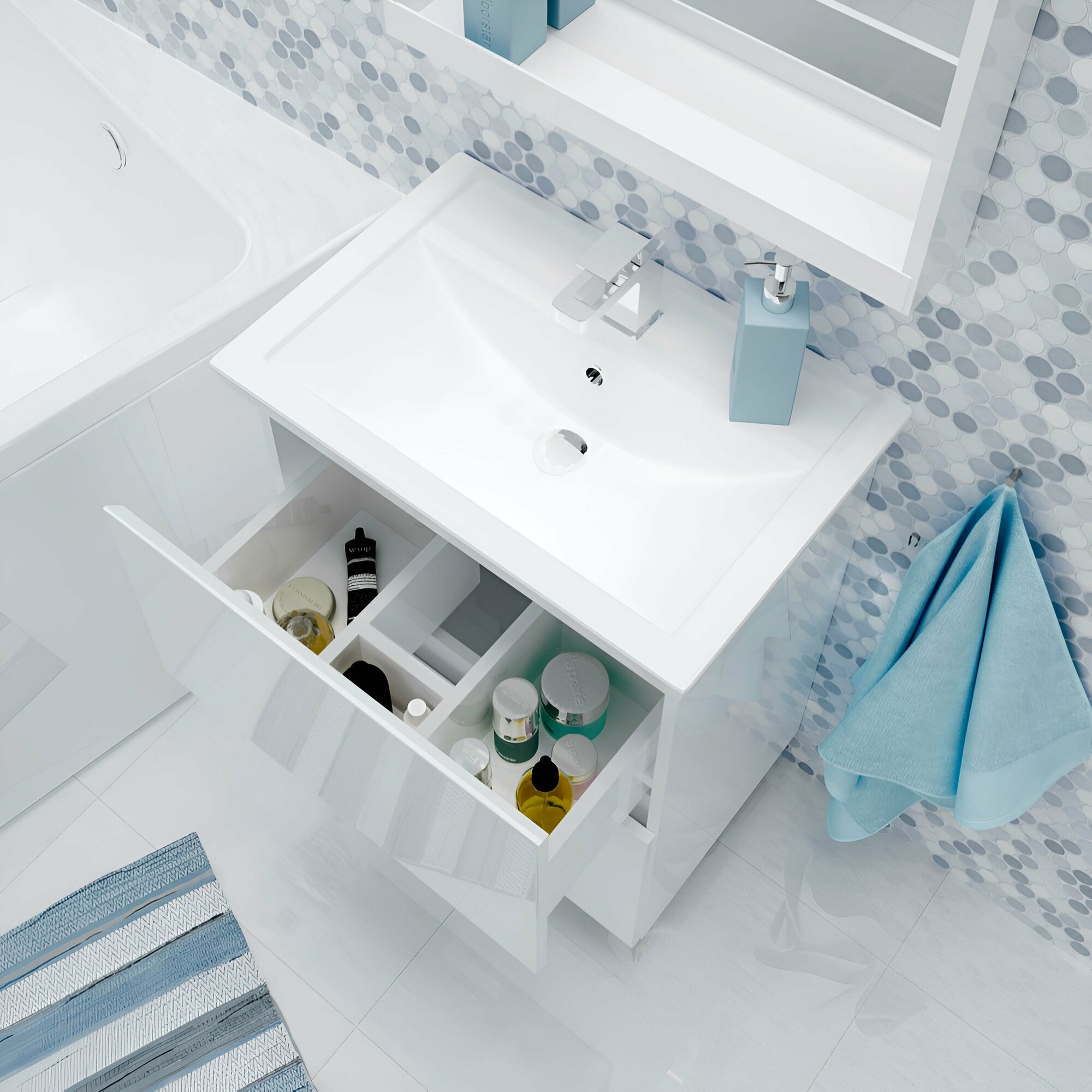 Тумба под раковину 1Marka New Aris 71 Ц0000019921 стильная и лаконичная для ванной комнаты, в дизайне которой нет ничего лишнего - только минимализм и акцент на безоговорочную функциональность. Отсутствие ручек и строгие геометрические формы делают ее актуальной для интерьеров в абсолютно любой современной или эклектичной стилистике. Благодаря качественной фурнитуре ежедневное использование тумбы отличается максимальным удобством. Практичное разделение ящиков на небольшие отсеки позволяет с комфортом организовать хранение косметики и других вещей. Глянцевая белая поверхность гармонично дополнит пространства в любой цветовой гамме.Преимущества модели: - конструкция без ручек: внешний вид не перегружен лишними деталями, а пользоваться шкафчиком еще удобнее; - прочность: металлические навесы выдерживают нагрузку до 130кг; - фактурная ЛДСП приятна на ощупь, передает ощутимый рельеф материала; - компактные габариты сильно экономят пространство ванной комнаты; - универсальный дизайн впишется в проект любой ванной комнаты;- технология Protect продлевает срок слуужбы изделия, препятствуя проникновению воды.