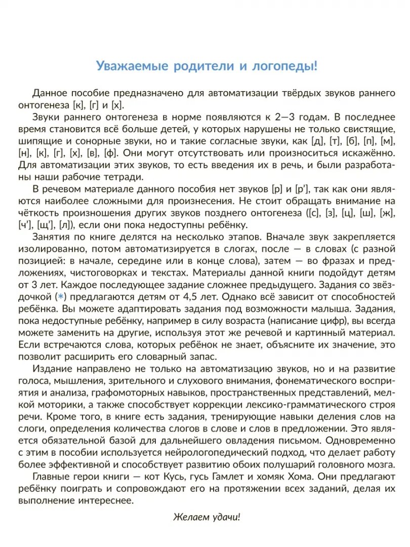 Данное пособие поможет ввести в речь ребенка твердые звуки раннего онтогенеза К, Г и Х. При этом в нем не используются сложные звуки Р и Рь. Вначале звук закрепляется изолированно, затем в слогах, в словах, во фразах и предложениях и только потом в текстах. Яркие иллюстрации, игровые задания и милые сквозные персонажи увлекут малыша и сделают занятия веселыми и интересными.