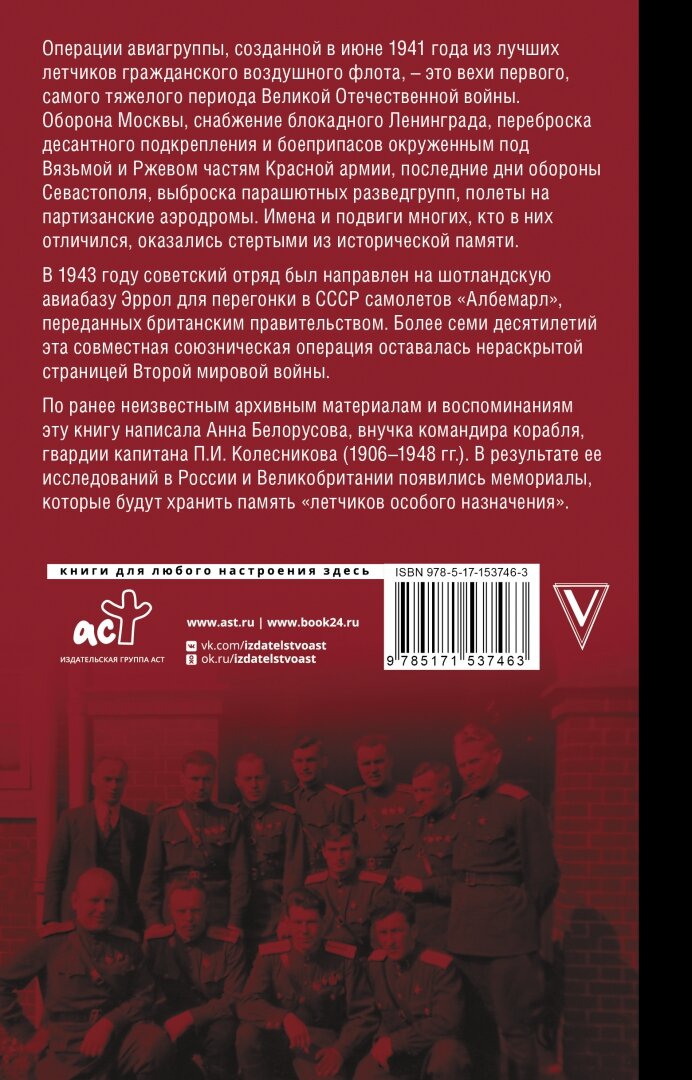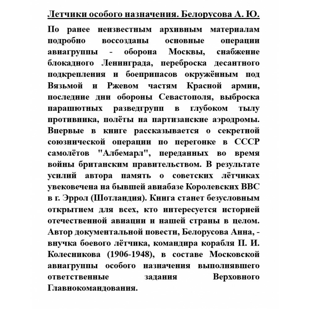 По ранее неизвестным архивным материалам и воспоминаниям эту книгу написала Анна Белорусова, внучка командира корабля, гвардии капитана П.И. Колесникова (1906-1948 гг.). В результате ее исследований в России и Великобритании появились мемориалы, которые будут хранить память "летчиков особого назначения".