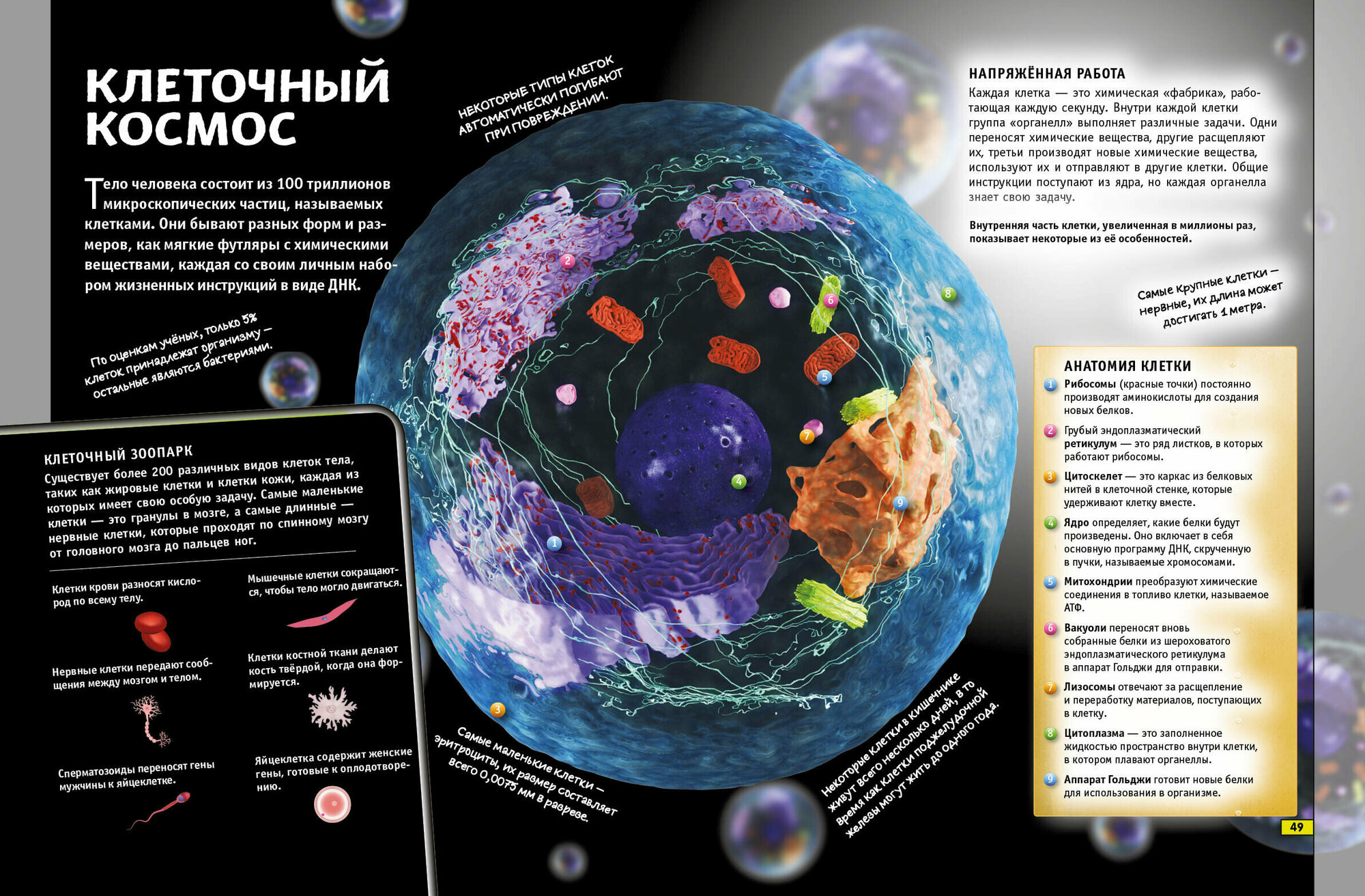 Юного эрудита ни за что не оставлю один на один с этой книгой! Только читать вместе с подкованным в науке взрослым. Прекрасная подача материала, мощный визуальный ряд и отвратительный перевод. В тексте про головной мозг указаны кортекс и церебеллум. Поисковик выдаёт, что это кора и мозжечок из школьного курса. А вот "волевые" мышцы, которые двигают кости поисковик не нашёл. Так как такого термина не существует, а есть скелетная мускулатура. Заголовок "Кожные жучки" к статье про бактерии вообще без комментариев.