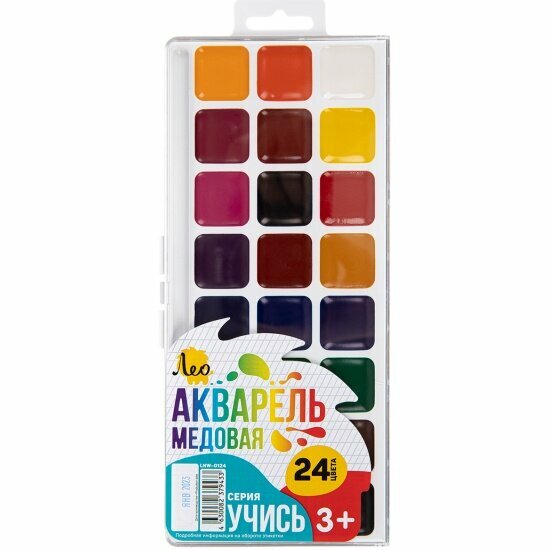 Медовая акварель ТМ Лео серии "Учись" сделает знакомство ребенка с этой непростой техникой приятным, увлекательным и веселым. Прекрасно подходит для занятий рисованием в детском саду, кружках, дома, школе. Акварель разработана с учетом рекомендаций педагогов, безопасна для детей, не токсична. Изготавливается на основе только натуральных компонентов.