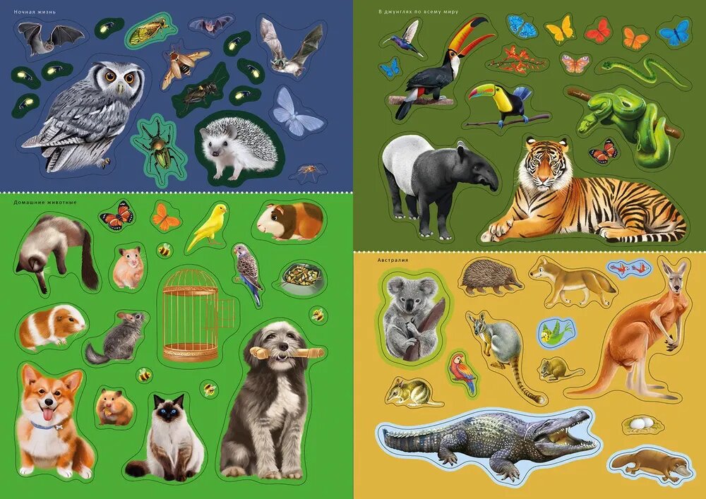 12 тематических фонов и более 200 наклеек на тему животных ребёнок изучит различные их виды: домашние и дикие, морские и лесные, ночные и живущие в коралловых рифах, на ферме, в Африке или в Австралии, в джунглях или там, где холодно