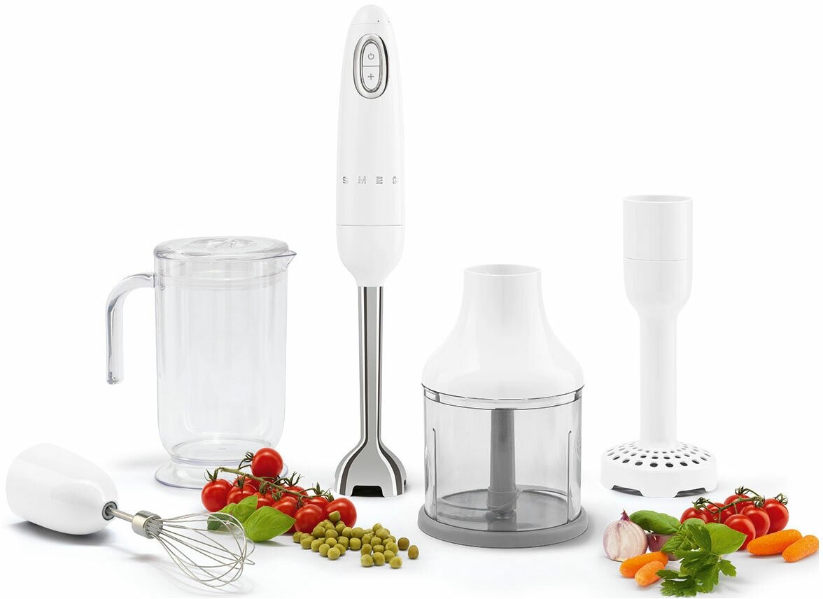 Блендер погружной Smeg представляет собой универсальный кухонный прибор для измельчения, перемешивания и взбивания продуктов. Особенности Погружной блендер с мощным мотором на 700 Вт, большим набором насадок и контейнеров. Корпус устройства выполнен из цветного пластика, а рабочая часть — из качественной нержавеющей стали. Эта эргономичная модель весит всего 2 кг, отлично сидит в руке и не скользит благодаря специальному покрытию. Подключение к сети 220-240В, для максимального удобства прибор оснащен длинным шнуром со специальным креплением. Регулировка вращения ножей осуществляется при помощи удобного переключателя на ручке, также здесь находятся кнопки включения и активации режима «Турбо». Комплектация модели впечатляет, вместе с блендером покупатель получает четыре полноценных модуля: универсальный венчик, насадку для пюре, контейнер-измельчитель и мерную чашу. Основная емкость объемом 1,4 литра изготовлен из полимера Tritan™, он активно используется в медицине и абсолютно гигиеничен. Прозрачная часть измельчителя на 0,5 литра тоже сделана из этого современного материала, а внутри расположены разноуровневые лезвия. Эти ножи из нержавеющей стали изготовлены по запатентованной технологии FlowBlend, они очень острые и отличаются повышенной износостойкостью. Практически все съемные детали блендера можно загружать в посудомоечную машину, поэтому проблем с обслуживанием и чисткой техники у вас точно не возникнет. Эстетика и управление Эргономичная и нескользящая рукоятка Крепление кабеля в комплекте Материал погружной части - нержавеющая сталь Ножи из нержавеющей стали с системой FlowBlend Кнопка регулировки скорости вращения ножей Кнопка ВКЛ/выкл Кнопка турбо режима Размеры Размеры блендера ДxШxВ 65x65x414 мм Размеры венчика ДxШxВ: 60x60x268 мм Размеры измельчителя. ДxШxВ: 136x136x203 мм Размеры пресса для картофеля ДxШxВ: 96x96x247 мм Размеры чаши ДxШxВ: 174x117x203 мм Размер упаковки ДxШxВ: 347x195x442 мм Вес нетто 2,00 кг Вес брутто 3,6 кг Аксессуары в комплекте Чаша 1.4 л чаша из TritanTM с съемной крышкой из TritanTM Маркировка уровня в Литрах/Унциях Эргономичная ручка Можно мыть в посудомоечной машине Измельчитель Контейнер из TritanTM объемом 0,5 л Верхняя крышка-адаптер в цвет корпуса блендера Разно уровневые ножи из нержавеющей стали Нескользящее основание серого цвета, которое можно использовать как крышку для контейнера Контейнер и ножи можно мыть в посудомоечной машине (крышку нельзя) Насадка для пюре Пластиковый корпус в цвет основного корпуса блендера Пластиковые ножи серого цвета с технологией медленного вращения для плавного давления картофеля или других вареных овощей. Насадка-венчик Венчик из нержавеющей стали Адаптер для соединения с блендером из пластика в цвет корпуса Венчик можно мыть в посудомоечной машине (Адаптер нельзя).