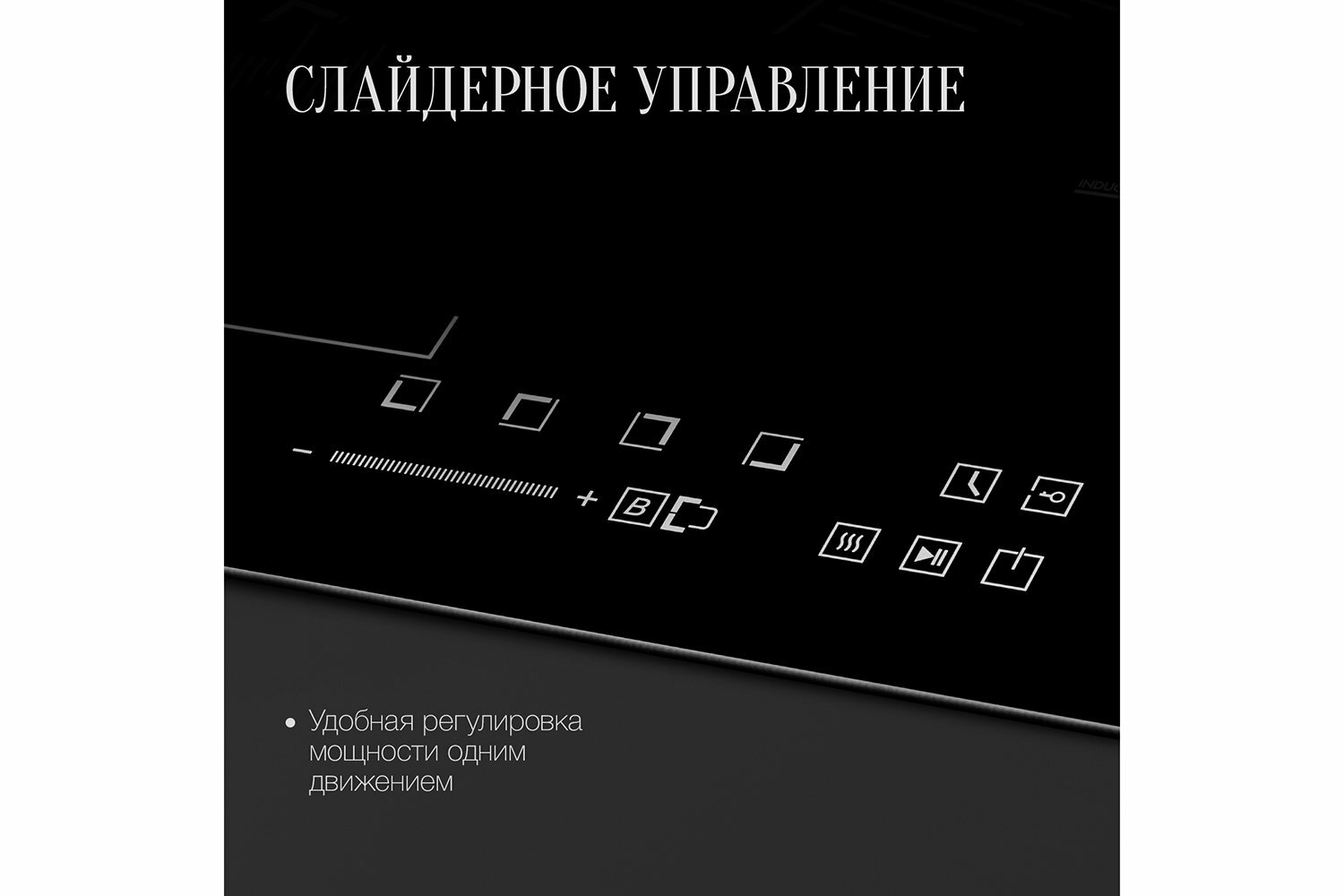 Благодаря встроенной функции слайдера, можно легкими движениями пальца быстро настроить параметры варочной поверхности, связанные с мощностью нагрева конфорки.