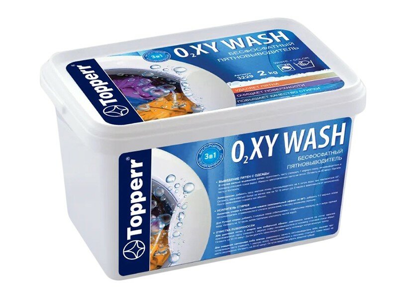 Пятновыводитель Topperr 3 в 1 - это мощное средство для удаления пятен и въевшихся загрязнений. Гарантируется небольшой расход и высокая эффективность. Благодаря функции 3 в 1 средство можно использовать как помощник для выведения пятен с одежды, очистки поверхности или как усилитель стирки в стиральной машине. После стирки с добавлением средства Вы увидите, что безнадежные пятна исчезли. Пятновыводитель для цветного белья эффективно выводит как красные пятна от вина, так и белые пятна на цветной одежде. Выведение пятен жира, чернила, шоколада, травы, пота-перестанет быть для вас головной болью. Любая детская вещь будет отстирана от самых разнообразных трудновыводимых пятен и приобретет привлекательный внешний вид. Кислородный пятновыводитель применяется как отбеливатель для белого белья, избавляет белые ткани от желтизны и серости. Средство предназначено не только для стирки белья, но и для снятия нагара с посуды, чистки кухонной утвари от въевшегося жира, удаления пищевого налета, чайного, кофейного и прочих органических налетов. Пятновыводитель кислородный Топперр способен очистить в домашних условиях ювелирные изделия от налета и потемнения. Пятновыводители Топперр способны очистить ковры, мягкую мебель и плитку. Кислородный очиститель — это эффективное средство для чистки межплиточных швов и удаления плесени. Очиститель Топперр позволяет значительно сэкономить на химчистке и клининге. Данное средство для уборки - экологичная бытовая химия. Средство не содержит хлора и фосфатов. Способы применения: В случае въевшихся пятен: приготовить пасту (смешать 1 мерную ложку пятновыводителя и половину столовой ложки воды). Нанести приготовленную пасту на пятно. Оставить на 60 минут. Удалить пасту и постирать. Замачивание: добавить одну мерную ложку пятновыводителя на 4 литра воды при температуре 40°. Оставить замачиваться белье не менее чем на 10-15 минут (до 5 часов в зависимости от загрязнения). После замачивания стирайте как обычно. Усилитель стирки в стиральной машине (максимальный эффект от 60°): добавить 1-2 мерных ложки пятновыводителя, в зависимости от степени загрязнения, к вашему основному порошку. Для ручной стирки: добавить 3 мерные ложки отбеливателя к стиральному порошку, на 2 литра горячей воды. Оставить на 12 часов, затем тщательно сполоснуть чистой водой. Для удаления пятен с ковров или мебельной обивки: равномерно нанести на пятно заранее приготовленную пасту (смешать 1 мерную ложку пятновыводителя и половину столовой ложки воды). Оставить на 10-15 минут. Далее удалить нанесённою ранее, пасту используя чистую влажную тряпку. Для очищения сантехники либо плитки: равномерно нанести пятновыводитель либо заранее приготовленную пасту (смешать 1 мерную ложку пятновыводителя и половину столовой ложки воды) на место загрязнения. Оставить на 30-40 минут. Остатки вещества убрать влажной губкой.