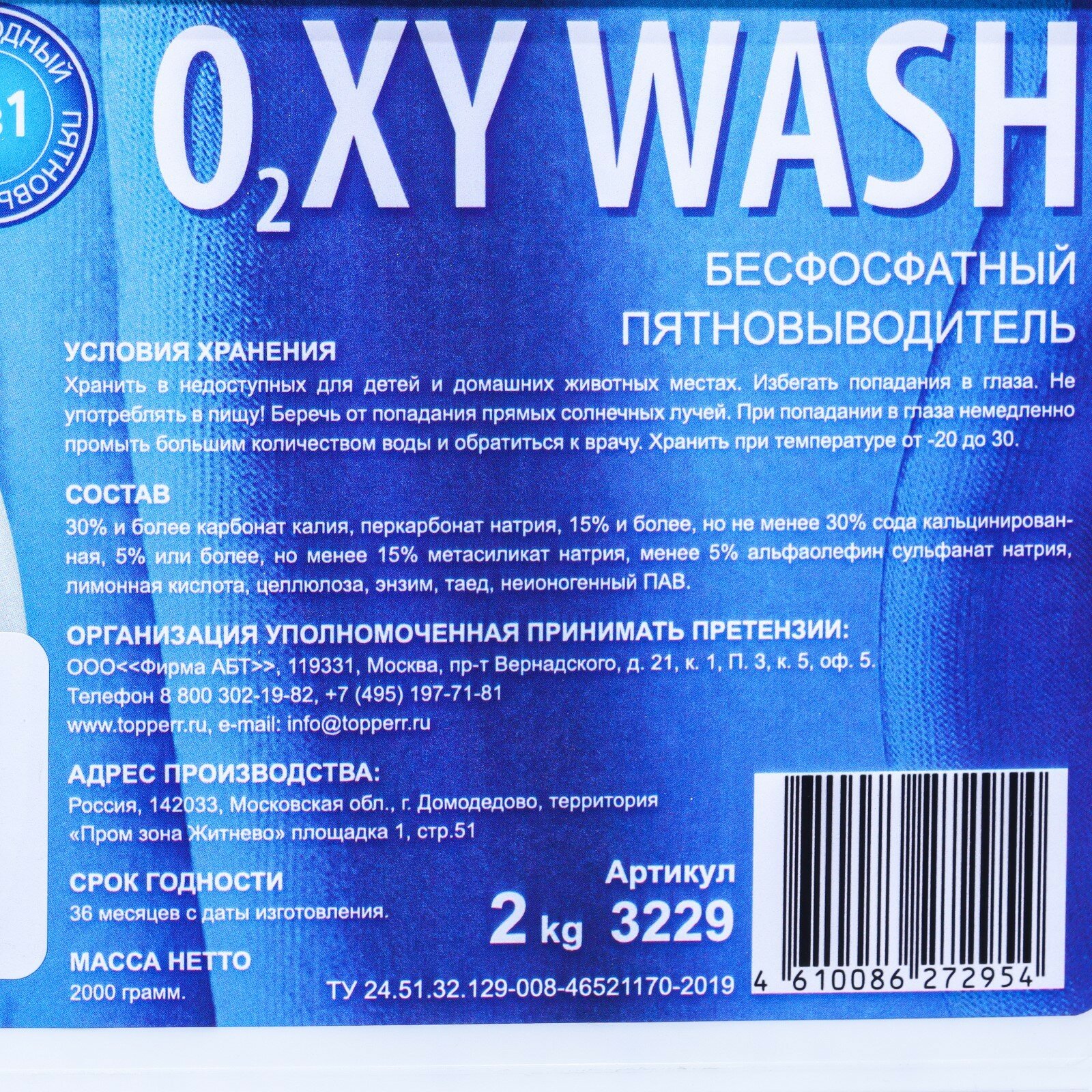 Тип товара: Усилитель стирки-пятновыводитель бесфосфатный
