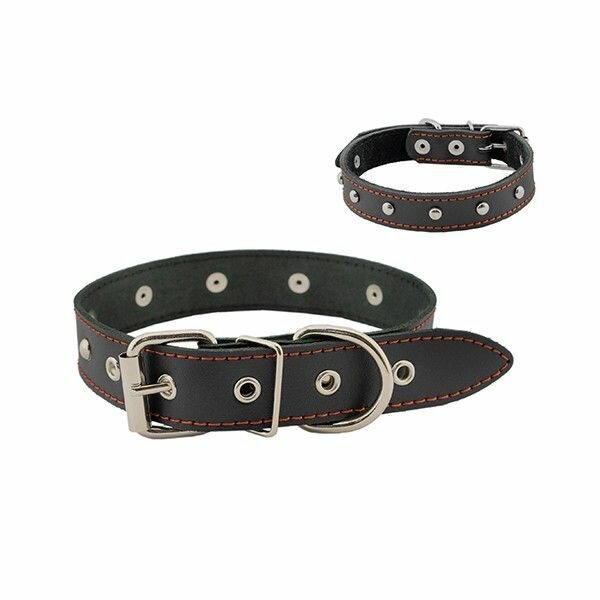 Однослойный кожаный ошейник из натуральной кожи с декоративной отстрочкой прочной нитью, и украшенный рядом металлических заклёпок. Отверстия для регулировки длины усилены металлическими блочками. Для крепления поводка установлено надежное никелированное полукольцо сварной конструкции. Ошейник предназначен для ежедневного выгула животного. Для защиты от непогоды и загрязнений ошейник можно дополнительно обработать специальными средствами для ухода за натуральной кожей.