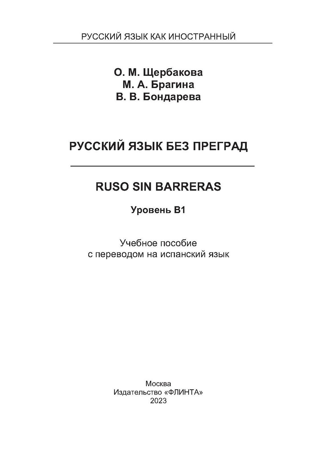 Русский язык без преград. Учебное пособие с переводом на испанский язык. Уровень B1 (Щербакова Ольга Маратовна, Брагина Марина Александровна, Бондарева Вероника Валерьевна); Флинта, 2025