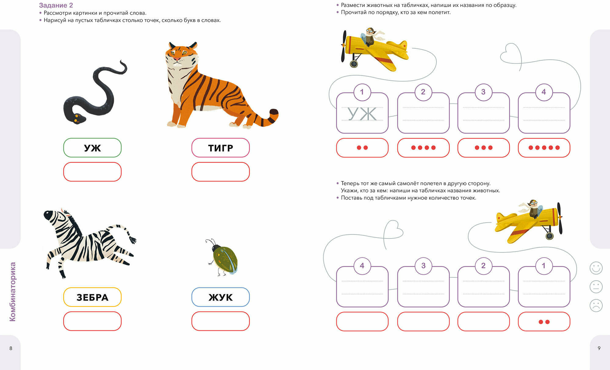 Эта тетрадь направлена на развитие у ребенка логического мышления и концентрации внимания, которые так нужны при поступлении в школу. Он научится комбинировать между собой разные объекты, находить закономерности их расположения, создавать новые сочетания по заданным условиям, распределять предметы по группам, классифицировать по признакам род/вид, находить закономерности и действовать по алгоритму.