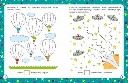 Занимаясь, ребёнок будет обводить по пунктиру, считать, писать цифры, сравнивать предметы по количеству и соотносить количество с числом, решать простые задачи на сложение и вычитание.