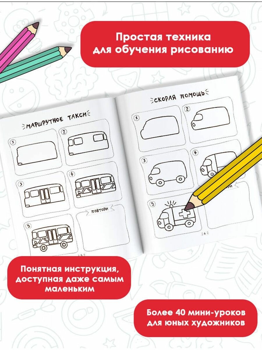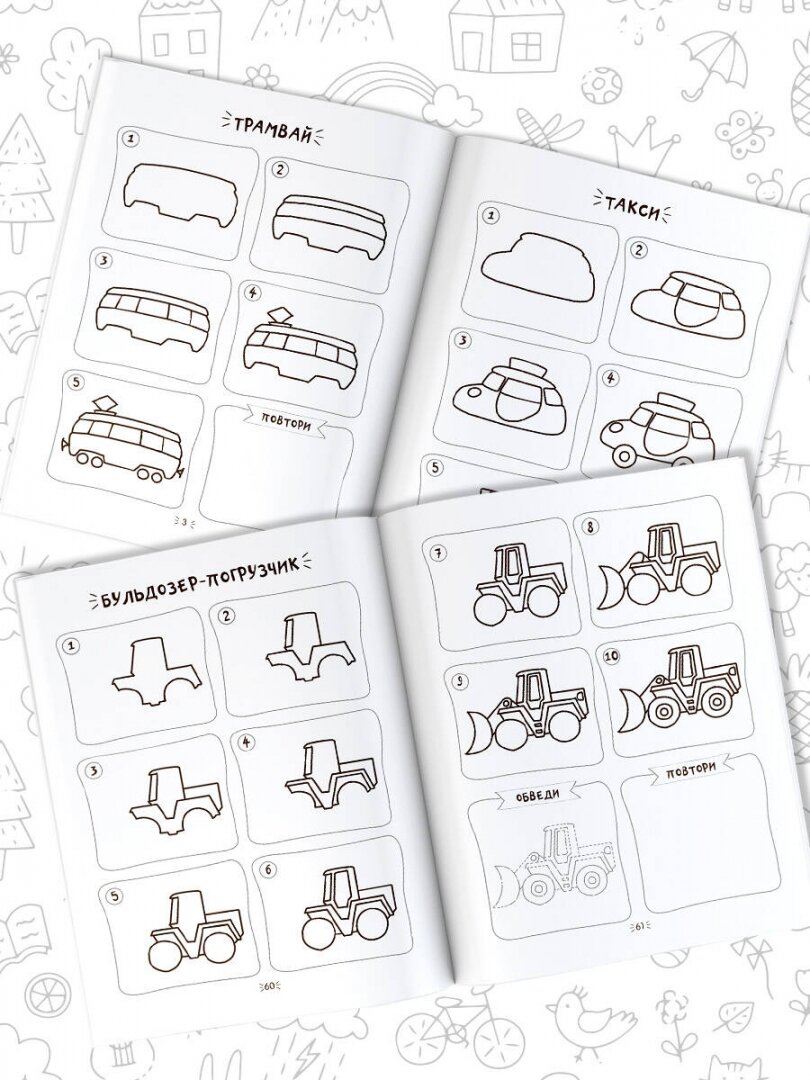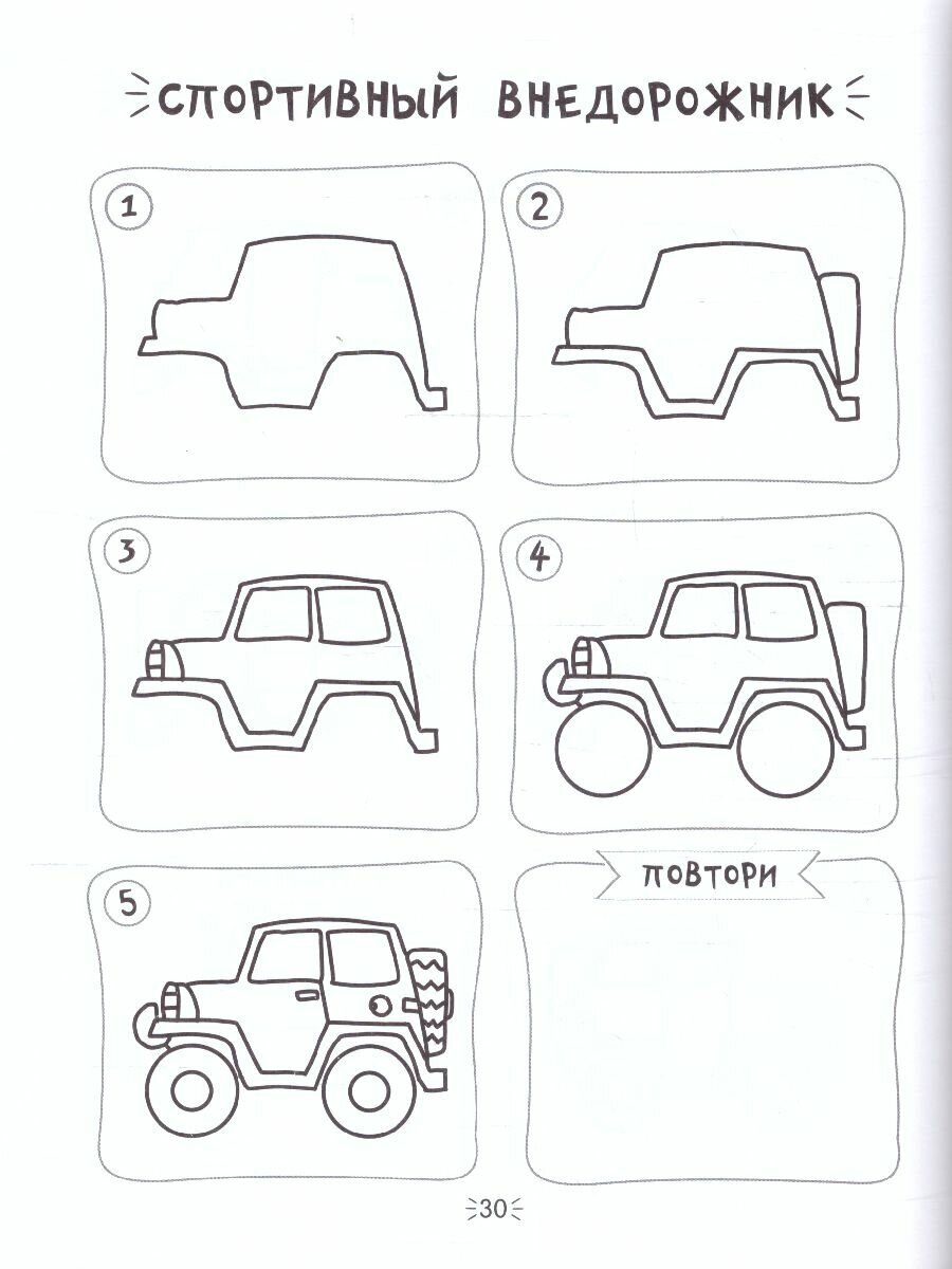 Давно не испытывала такого восторга, особенно от такого маленького пособия-развивалки. За такую сумму я получила пару часов отдыха. Ребенок с удовольствием занимался сам с помощью этой книжечки. В нее входит инструкции в картинках, как нарисовать машину/самолет/дом. Инструкция очень классная. На каждой новой картинке добавляется деталь, которую нужно нарисовать. Это чудесно! Все получается легко и красиво.