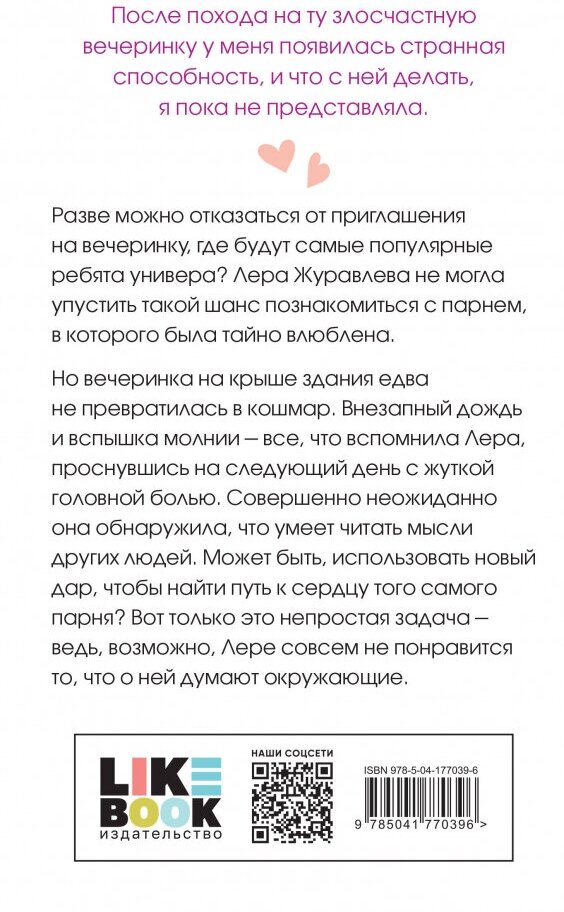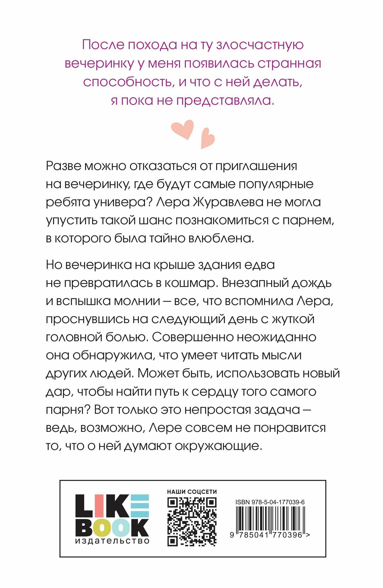 Но вечеринка на крыше здания едва не превратилась в кошмар. Внезапный дождь и вспышка молнии — все, что вспомнила Лера, проснувшись на следующий день с жуткой головной болью. Совершенно неожиданно она обнаружила, что умеет читать мысли других людей. Может быть, использовать новый дар, чтобы найти путь к сердцу того самого парня? Вот только это непростая задача — ведь, возможно, Лере совсем не понравится то, что о ней думают окружающие.