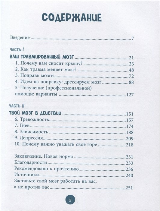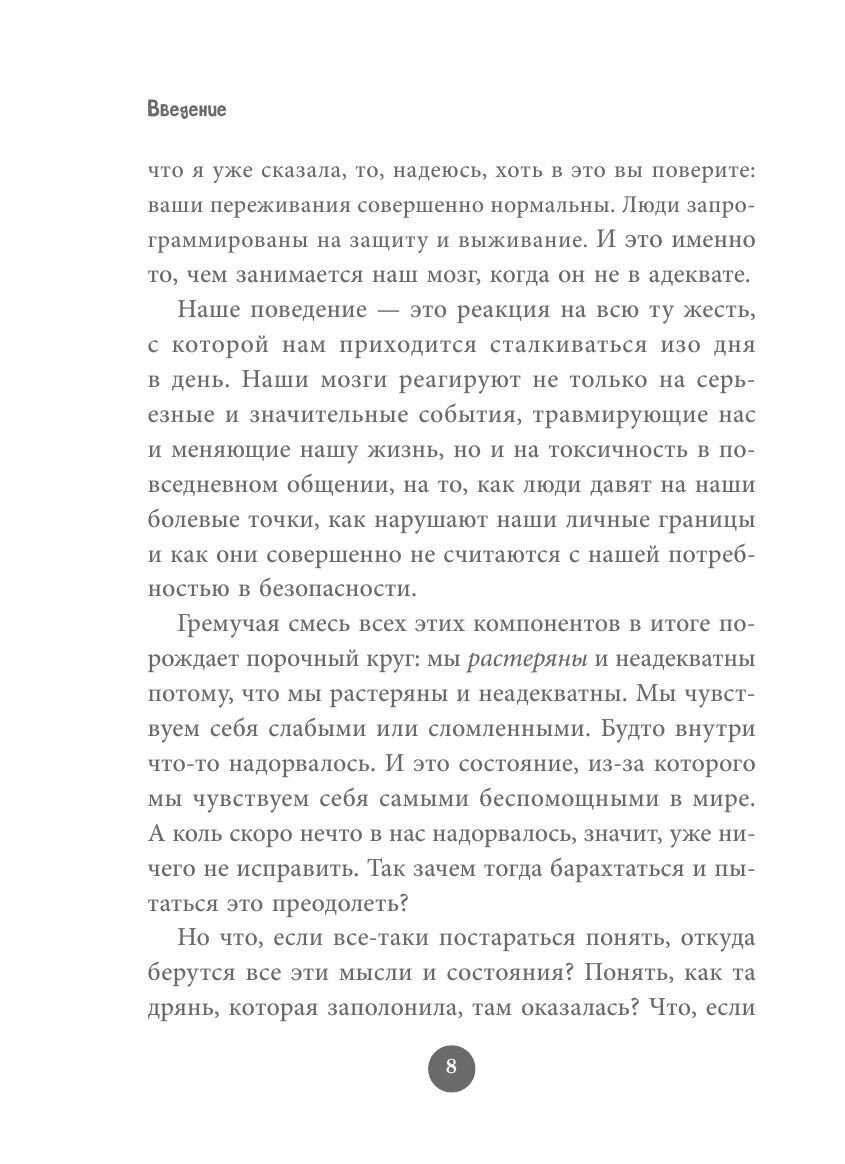 Я очень тревожный человек, и купила эту книгу из-за обещаний мощных практик, которые должны с этим помочь. На самом деле, автор затрагивает много тем: от проблем с гневом до депрессии и ПТСР. Информация там подается простым языком и вполне подходит для общего понимания работы мозга в контексте психологических травм. Самостоятельно эта книга, конечно, от проблем не излечит, но может помочь: техники самопомощи там тоже есть. Некоторые советы я теперь использую в повседневной жизни. Например, действительно полезной оказалась рекомендация создать карточки-напоминалки о способах уменьшения тревоги и пользоваться ими в моменты сильного стресса.