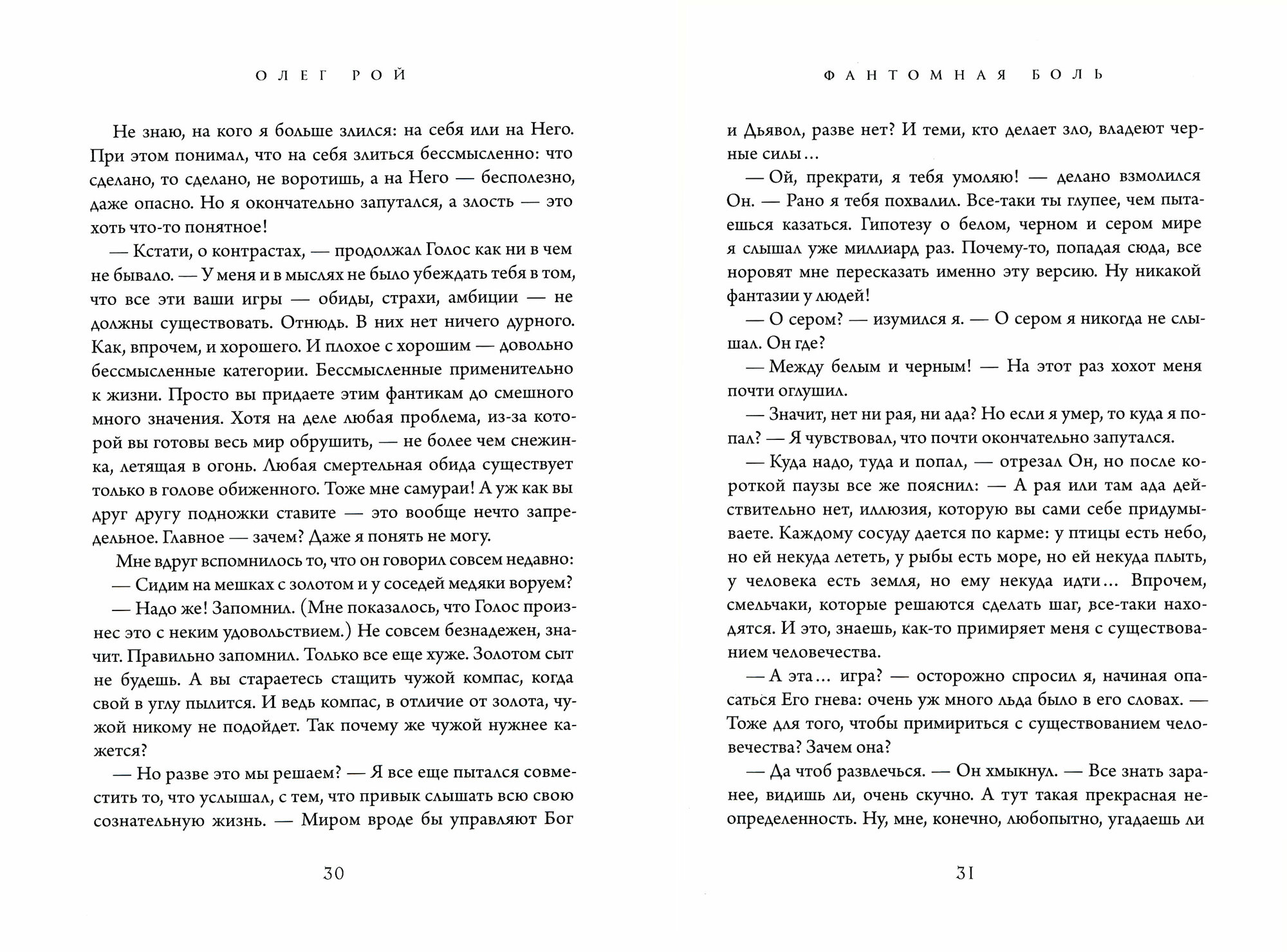 Я прочитала достаточно книг авторства Олега Роя. Какие-то из них между собой похожи, какие-то абсолютно разные; какие-то мне понравились настолько, что я их перечитала ещё раз, а какие-то так и остались просто прочитанными. Так вот Фантомная боль - это та история, которую я прочитала несколько раз и перечитаю ещё. Мне нравится как она написана. Возможно, мне не так сильно и симпатичны персонажи этого романа, но мне нравится то, как Рой рассказывал историю каждого из них. А финал был для меня неожиданным поворотом.