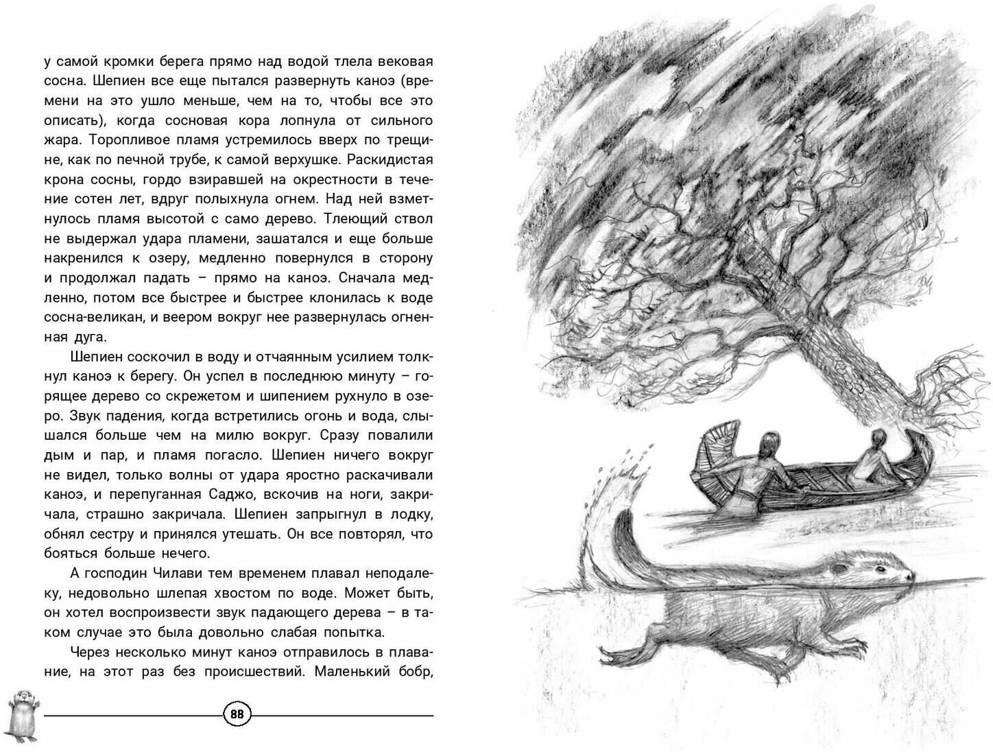 Описание жизни бобрят и детей очень трогательное, подробное и нескучное. Конечно, в идиллию вторгается внешний мир в лице торговца пушниной, который берет одного из бобрят за долги. И дальше мы следим, как это событие отражается на судьбах детей и второго бобренка. Конечно, дети отправятся спасать малыша. И конечно, они его спасут.