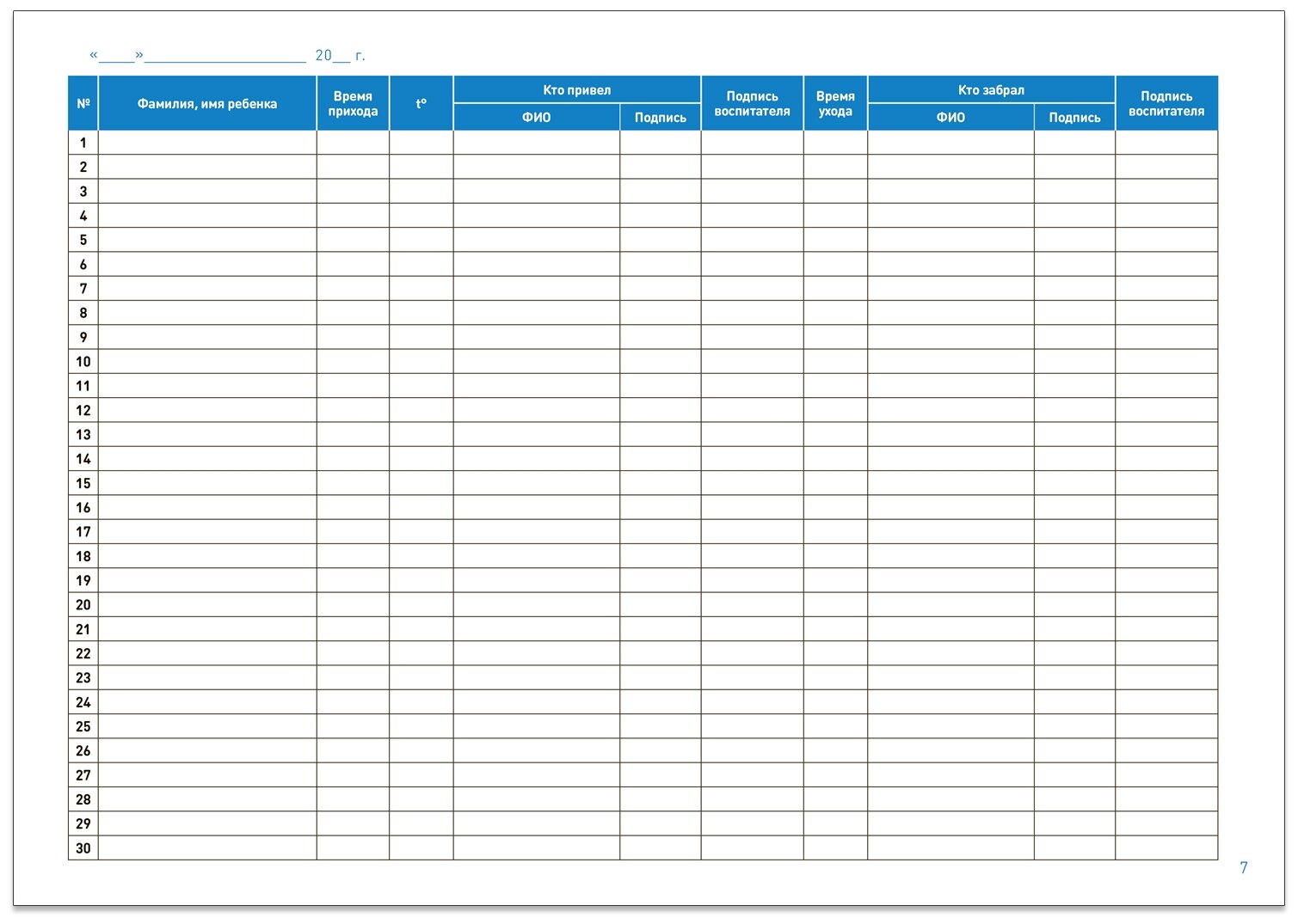 В помощь воспитателям предложена единообразная форма ведения журнала. Журнал содержит графы: ФИО ребенка, время прихода, состояние здоровья, ФИО кто привел, подпись, подпись воспитателя, время ухода, ФИО кто забрал, подпись, подпись воспитателя.