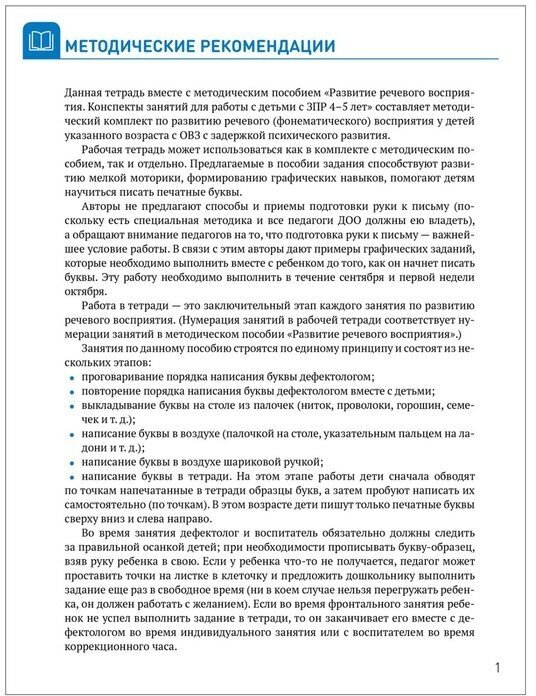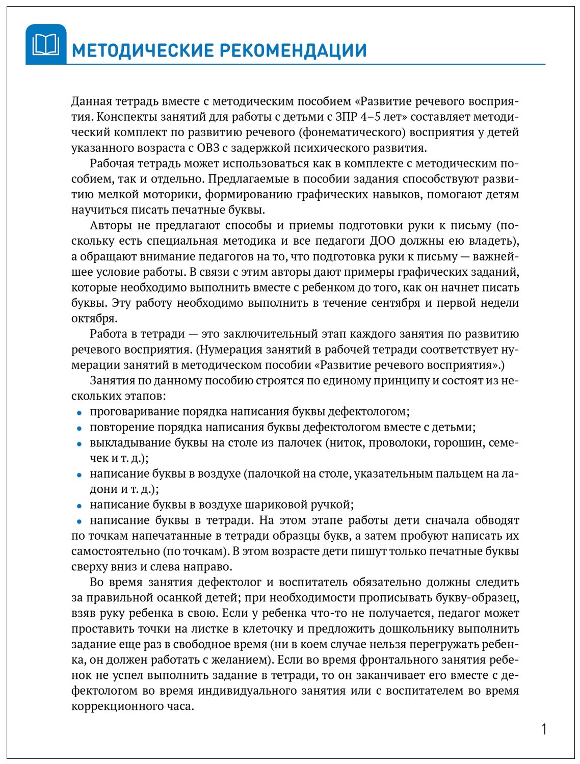Данная тетрадь вместе с методическим пособием «Развитие речевого восприятия. Конспекты занятий для работы с детьми с ЗПР 4–5 лет» составляет методический комплект по развитию речевого (фонематического) восприятия у детей указанного возраста с ОВЗ с задержкой психического развития.