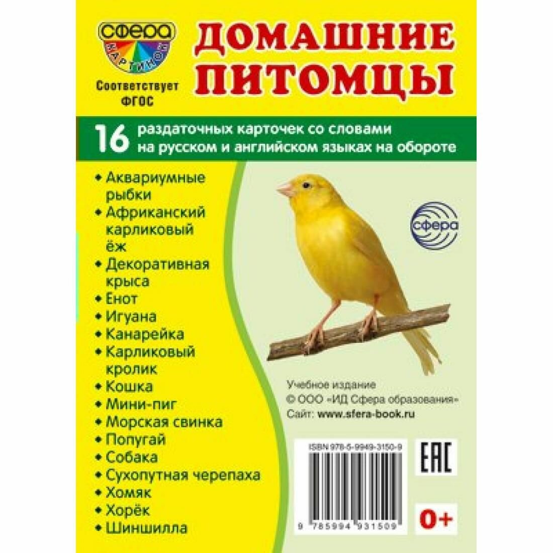 Издательство «ТЦ Сфера» представляет комплект серии «Сфера картинок» под названием «Домашние питомцы». Он состоит из 16 цветных демонстрационных карточек (картинок) и адресован детям и их родителям, желающим не только познакомиться с особенностями того или иного животного, но и при желании взять его в семью на воспитание. На лицевой стороне каждой карточки дается цветное изображение домашнего питомца, на обратной — подробное описание, из которого дети узнают немало важных фактов о правильном воспитании животного, уходе за ним, содержании и кормлении. Для лучшего закрепления материала представлены оригинальные стихотворения и рифмованные загадки по теме, а также вопросы, на которые ребенок ответит после изучения материала или беседы со взрослым. Дополнительно к комплекту можно приобрести раздаточные карточки, которые легко уместятся в руке ребенка, и плакат формата А2. Это необходимо для занятий в дошкольных образовательных организациях и школах.