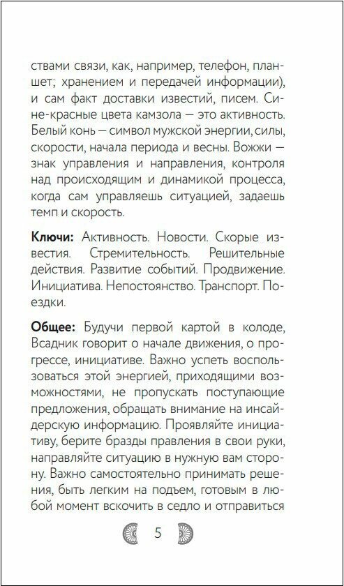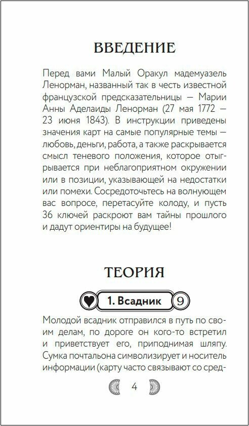 В руководстве к колоде, созданном Анной Огински, автором популярного самоучителя "Оракул Ленорман" приведены значения карт на самые популярные темы - любовь, деньги, работа, а также раскрывается смысл теневого положения, которое отыгрывается при неблагоприятном окружении или в позиции, указывающей на недостатки или помехи.