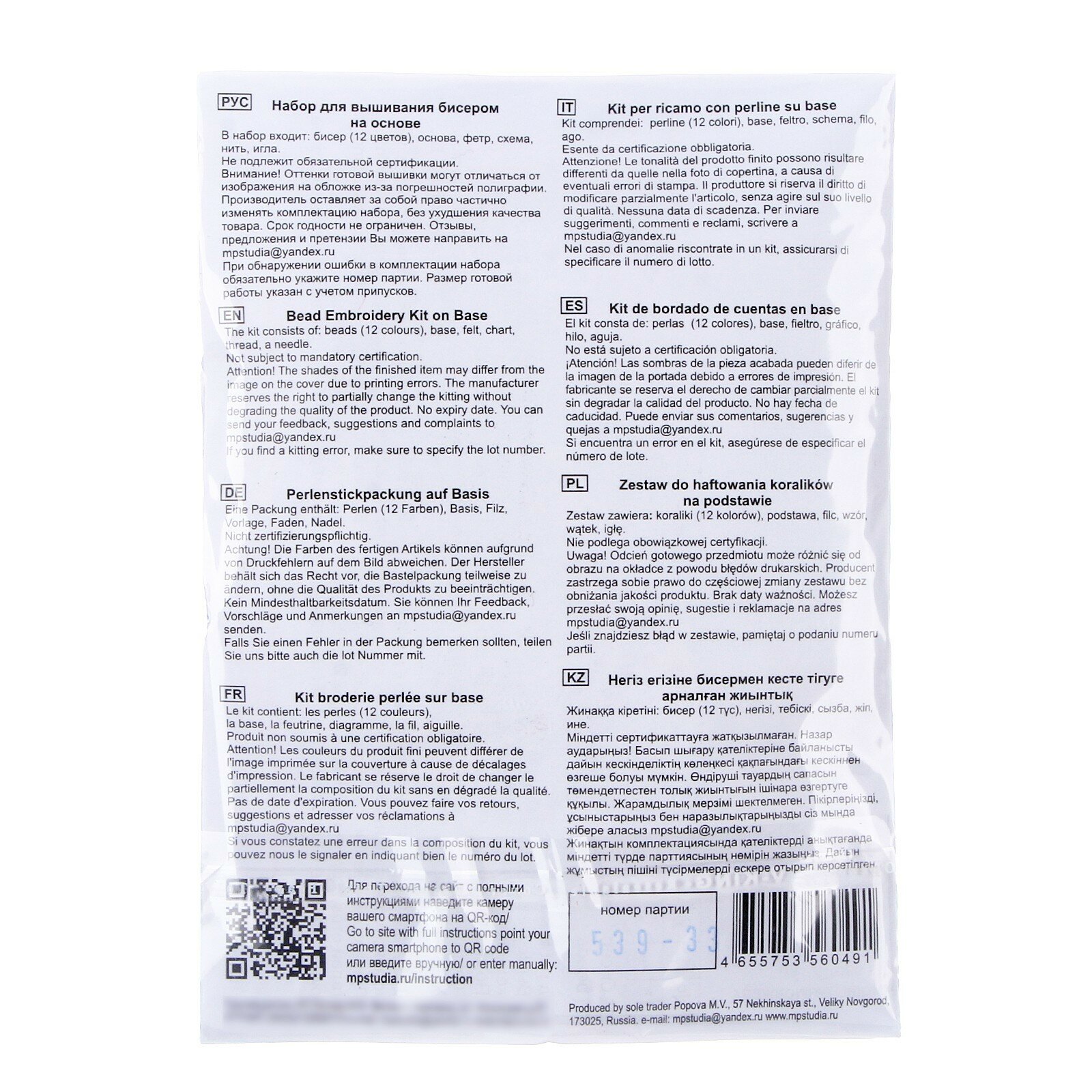 | В набор входит | тонированная перфорированная деревянная основа, бисер Preciosa 12 цветов, зелёный фетр для обработки задника, деревянная подставка, игла, двухцветная схема и руководство по вышиванию |