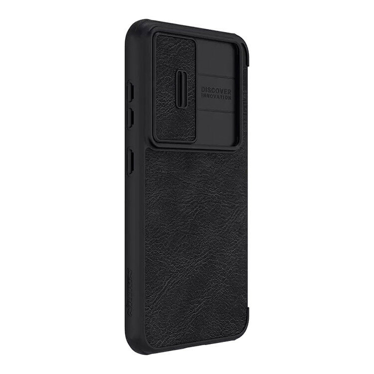 Чехол-книжка бренда Nillkin обеспечит надежную защиту вашему Samsung Galaxy S23+. Чехол изготовлен из качественной экокожи, нанесенной на пластиковый корпус с силиконовым бампером. Внутренняя часть чехла покрыта микрофиброй, которая защищает телефон от потёртостей и иных внешних воздействий. Камера смартфона дополнительно защищена шторкой, которая быстро и без особых усилий сдвигается в сторону. На внутренней стороне чехла расположены два отделения для хранения карт или визиток. Чехол плотно облегает телефон и защищает его от повреждений, которые могут быть получены в процессе ежедневной эксплуатации. Клавиши продублированы накладками, интегрированными в чехол, что защищает их от попадания грязи, пыли и воды. Аккуратные отверстия точно совпадают с разъемами и прочими элементами управления. Бампер удобен в использовании и не препятствует передаче сигналов NFC. Довершает дизайн металлический логотип бренда.