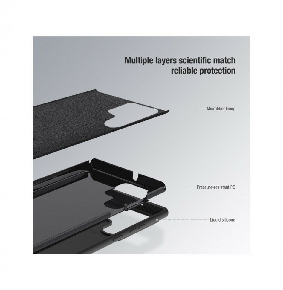 Чехол-накладка бренда Nillkin обеспечит надежную защиту вашего Samsung Galaxy S23 Ultra. Изделие выполнено из легкого пластика покрытого слоем жидкого силикона с эффектом Soft-touch, благодаря чему, чехол не скользит в руках и приятен на ощупь. Внутренняя часть чехла покрыта микрофиброй, которая защищает телефон от потёртостей и иных внешних воздействий. Камера смартфона дополнительно защищена шторкой, которая быстро и без особых усилий сдвигается в сторону. Боковые грани изделия слегка выступают над плоскостью экрана, что препятствует появлению на нём царапин, возникающих при соприкосновении с твёрдыми поверхностями. Клавиши продублированы накладками, интегрированными в чехол, что защищает их от попадания грязи, пыли и воды. Аккуратные отверстия точно совпадают с разъемами и прочими элементами управления. Чехол плотно облегает телефон и защищает его от повреждений, которые могут быть получены в процессе ежедневной эксплуатации. Бампер удобен в использовании и не препятствует передаче сигналов NFC.