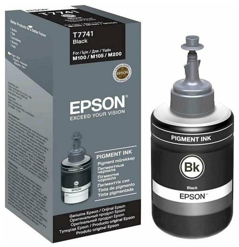 Чернила Epson C13T7741981 черного цвета гарантируют распечатанным документам аккуратный и презентабельный внешний вид. Одного пузырька Epson C13T774198 хватает на распечатку примерно 6000 страниц текста на стандартном формате бумаги А4. Изображение не выцветает со временем, на нем отсутствуют подтеки и смазывания.
