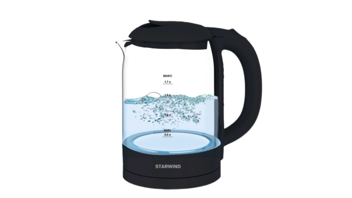 | Прочие особенности и свойства | Starwind SKG4031 – это электрический чайник с прозрачными стенками и яркой подсветкой, выполненный в минималистичном дизайне., , Максимальный объём жидкости, который вмещает прибор, составляет 1,7 л. При этом данная модель оснащена защитой от включения без воды, что позволяет чайнику не перегреваться. Стекло, из которого выполнена большая часть его корпуса, хорошо держит температуру. На нём нанесены отметки, по которым удобно ориентироваться., , Когда Starwind SKG4031 работает, жидкость в нём ярко подсвечивается, чтобы устройство было удобно использовать даже в темноте. Также свет служит индикацией того, что чайник работает. Когда вода закипает, прибор автоматически отключается и издаёт характерный щелчок. Мощность 2200 Вт позволяет сделать кипяток за считанные минуты., , Чтобы начать нагрев, достаточно залить в Starwind SKG4031 требуемый объём воды выше риски «минимум» и нажать всего одну кнопку., , Прибор оснащён скрытым нагревательным элементом и свободно проворачивается на подставке на 360 градусов. |