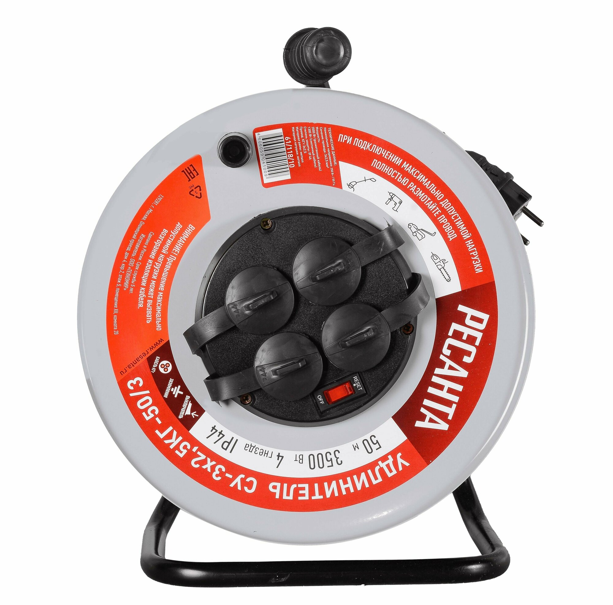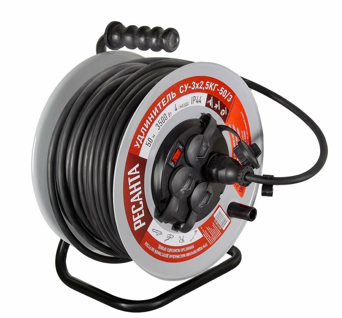 Удлинитель силовой Ресанта СУ-3х2,5КГ-50/3, кабель 2x1.0кв.мм ПВС, 4розет., длина 40м, катушка, серый (61/118/10)