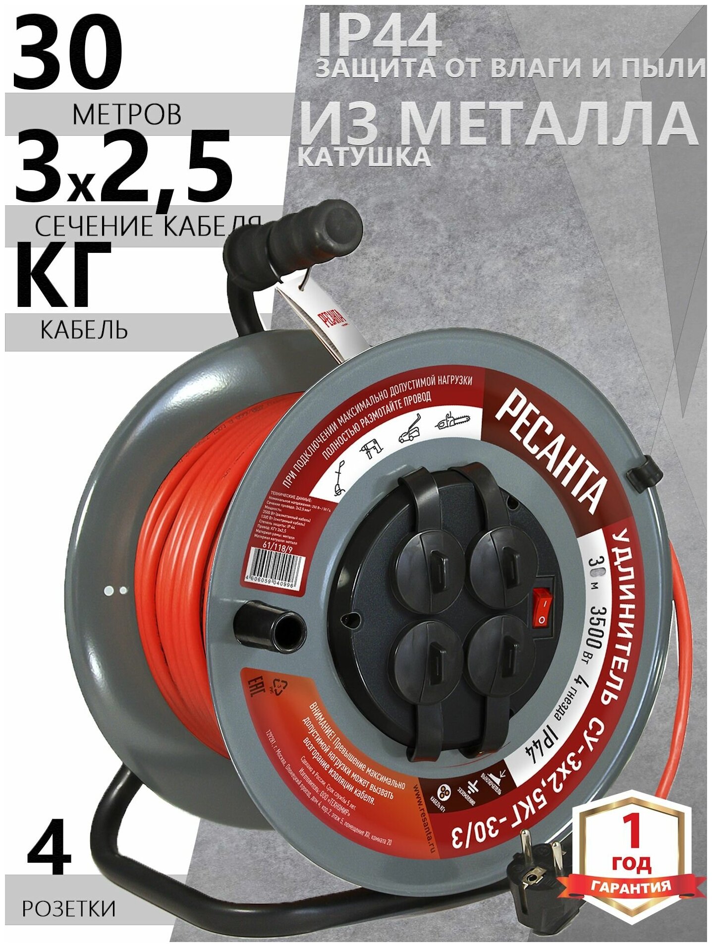 Удлинитель силовой Ресанта СУ-3х2,5КГ-30/3 используется для работы на строительных площадках или дачных участках. Удобен при работе с приборами, находящимися удаленно от стационарной розетки. Например газонокосилки, электрические пилы, триммеры или электродрели. Подходит для подключения к сети мощных электроприборов (до 3,5 кВт).