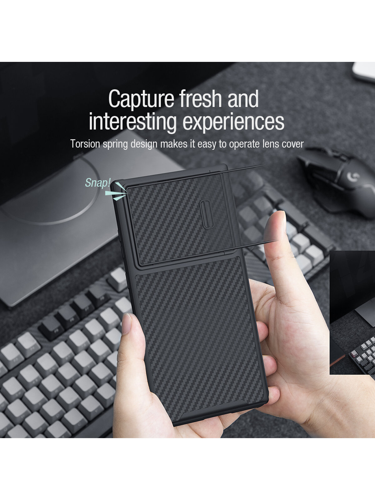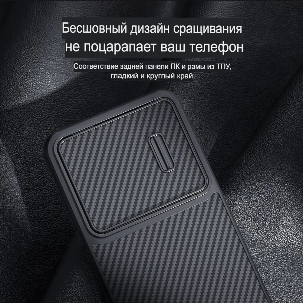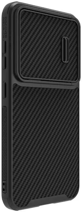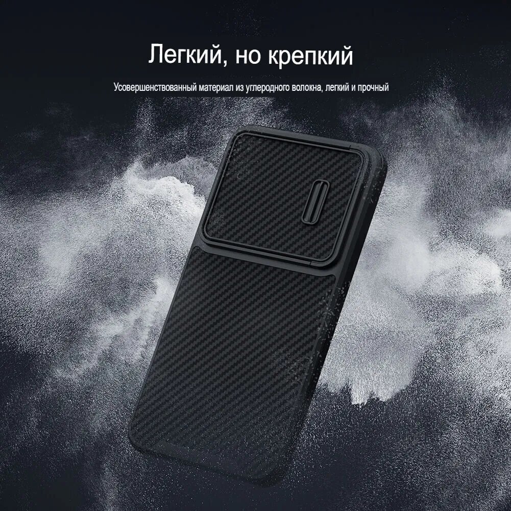 Чехол-накладка бренда Nillkin надежно защитит ваш Samsung Galaxy S23 Ultra. Чехол изготовлен из легкого и прочного углеродного волокна (карбоновой нити) в сочетании с силиконовым бампером. Аксессуар выполнен по технологии бесшовного литья, что позволяет избежать швов и стыков, в которые попадает пыль. Карбоновая вставка хорошо защищает телефон от царапин и повреждений, возникающих при падении и ударах, при этом она легче обычного пластика, чехол имеет небольшой вес. Поверхность чехла обработана специальным покрытием, благодаря которому изделие не скользит в руках и на нем практически не остаются отпечатки пальцев. Камера смартфона дополнительно защищена шторкой на торсионной пружине, которая быстро и без особых усилий сдвигается в сторону. Высокие бортики вокруг экрана оберегают телефон от механических дефектов. Клавиши продублированы накладками, интегрированными в чехол, для защиты от попадания грязи, пыли и воды. Бампер удобен в использовании и не препятствует передаче сигналов NFC.