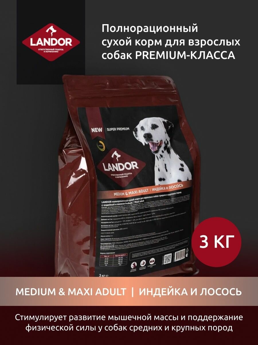 Landor полнорационный сухой корм для взрослых собак cредних и крупных пород (Индейка и лосось 3 кг.)