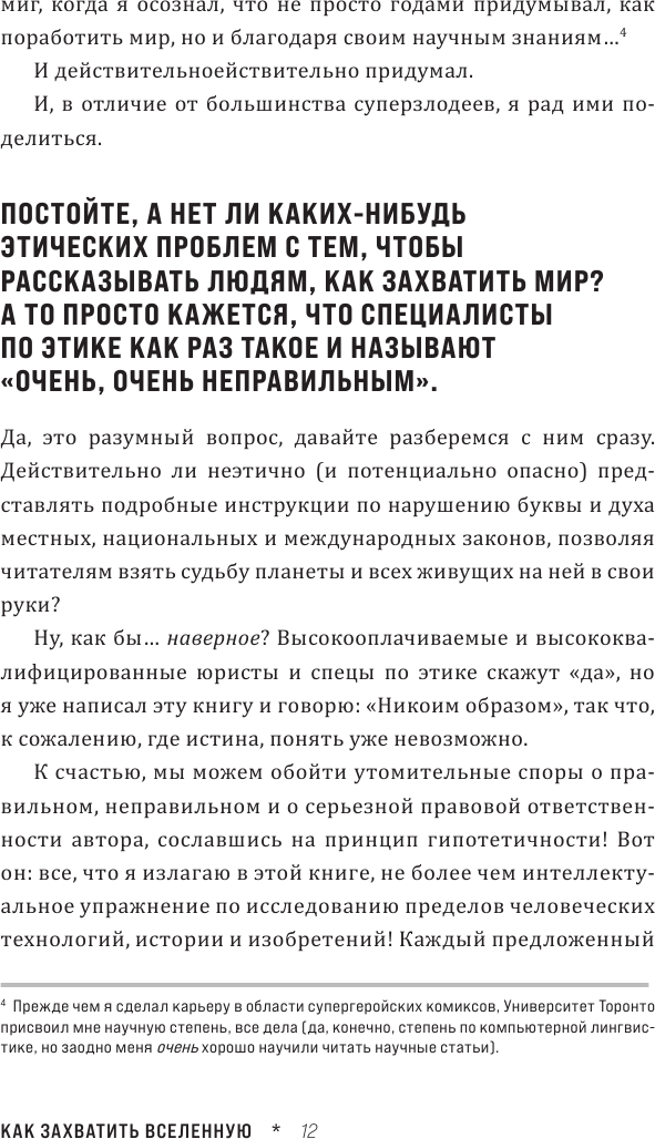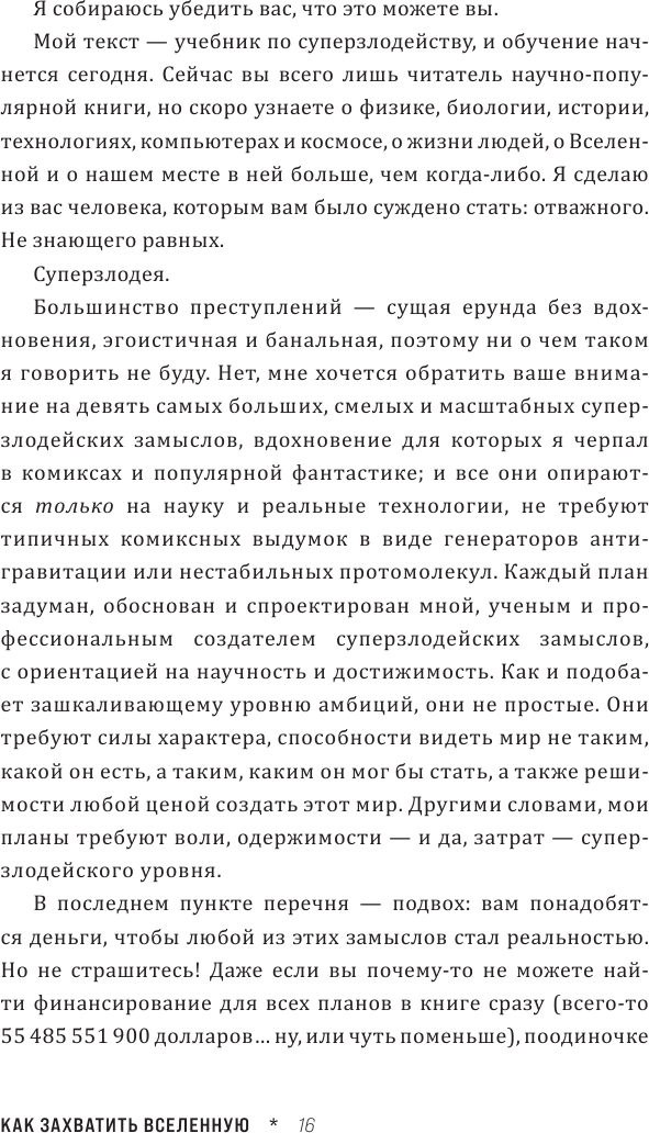 В каждом разделе книги предлагается сначала теория, потом план по получению чего-либо, свойственному суперзлодею. Конечно же все приправлено юмором и небольшим абсурдом, но от этого становится только еще более захватывающе. Приятно, что к планам и теории прилагаются(с анализом ошибок) провальные планы людей, которые пытались в реальной жизни. Также здорово, что в данном научпоп есть исследования многих сфер жизни: можно узнать правовые основы государств, достижения науки и техники, некоторые основы химии, биологии, физики и много чего еще