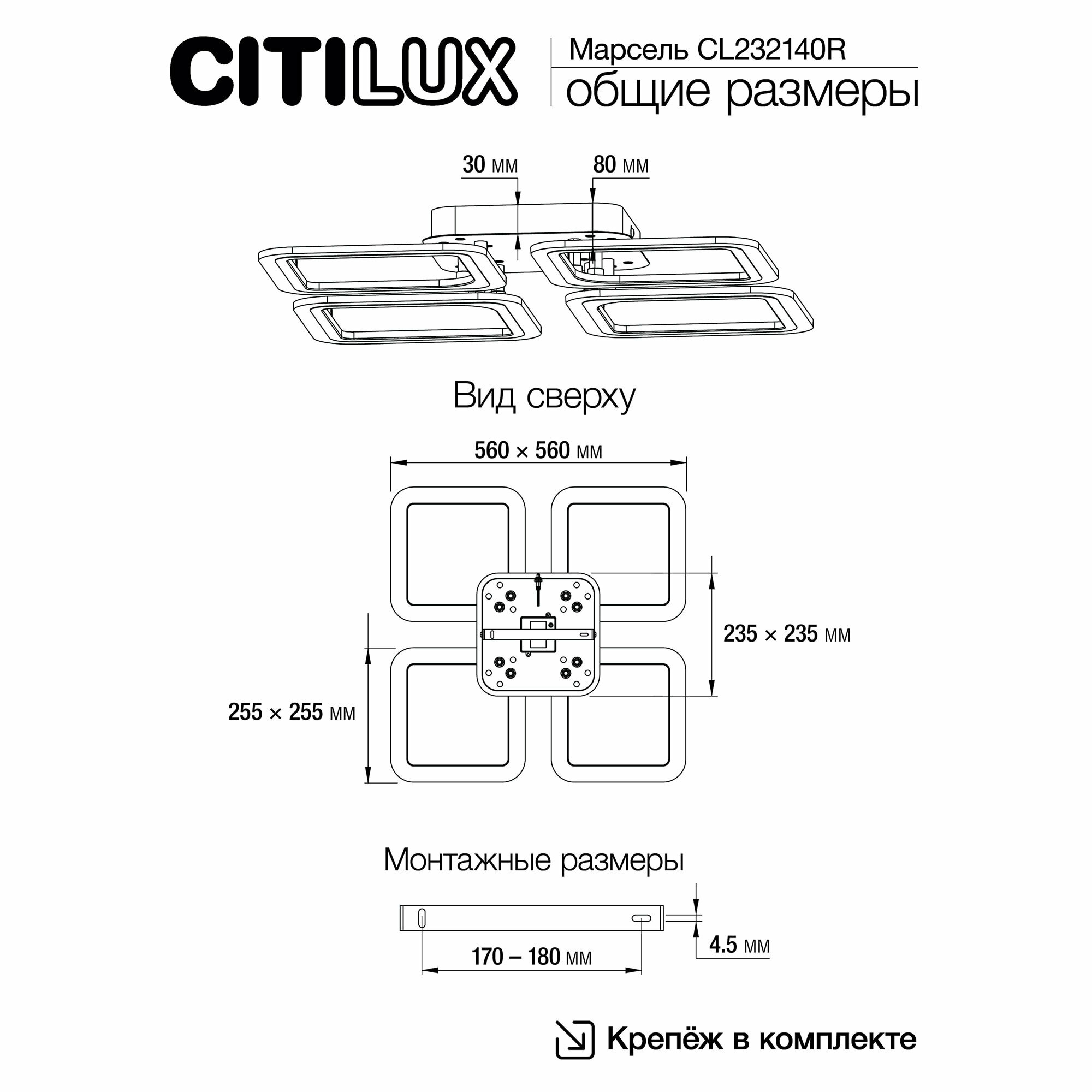 Светодиодная потолочная люстра Citilux Марсель CL232140R с пультом дистанционного управления. Металлическое основание и четыре светодиодных модуля плафона, формирующих внешний вид люстры, имеют квадратную форму. Корпус плафонов металлический, рассеиватель из оптического полимера. Люстрой можно управлять с помощью пульта дистанционного управления и настенным выключателем. Изделие оснащено яркими светодиодами, с возможностью плавной регулировки яркости от 10% до 100%. Цветовая температура регулируется в диапазоне от 3000К до 5500К, позволяя настроить любые оттенки теплого, нейтрального или холодного света, без мерцания и пульсаций. Есть настраиваемые режимы памяти и таймер выключения. Модель подходит для всех типов потолков, в том числе натяжных. Тип крепления – планка. Пульт ДУ в комплекте, тип батареек ААА (батарейками не комплектуется). Люстра плоская – высота всего 8см, размер 60х60см, мощность 70Вт, световой поток 7000Лм.