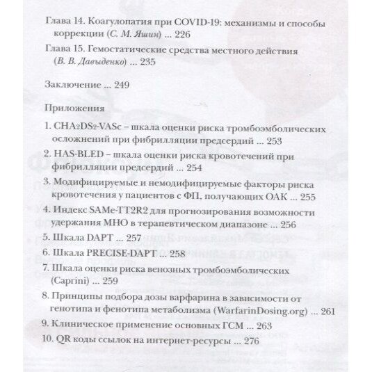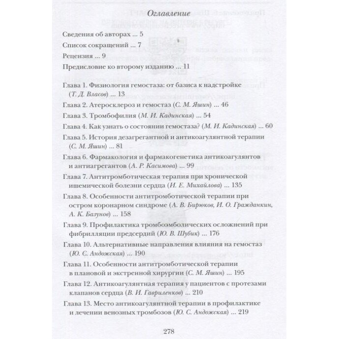 В книге представлены основы физиологии системы гемостаза и лабораторной диагностики, история разработки антикоагулянтов и антиагрегантов, особенности их применения, в том числе с учетом генетических факторов. Сделан акцент на тактике ведения больных после операций реваскуляризации миокарда или имеющих протезы клапанов сердца. Изложены алгоритмы коррекции антитромботической терапии при необходимости выполнения пациентам инвазивных вмешательств. Отдельные главы посвящены антикоагулянтной терапии у больных с фибрилляцией предсердий и венозными тромбозами, гемостатическим препаратам местного действия.