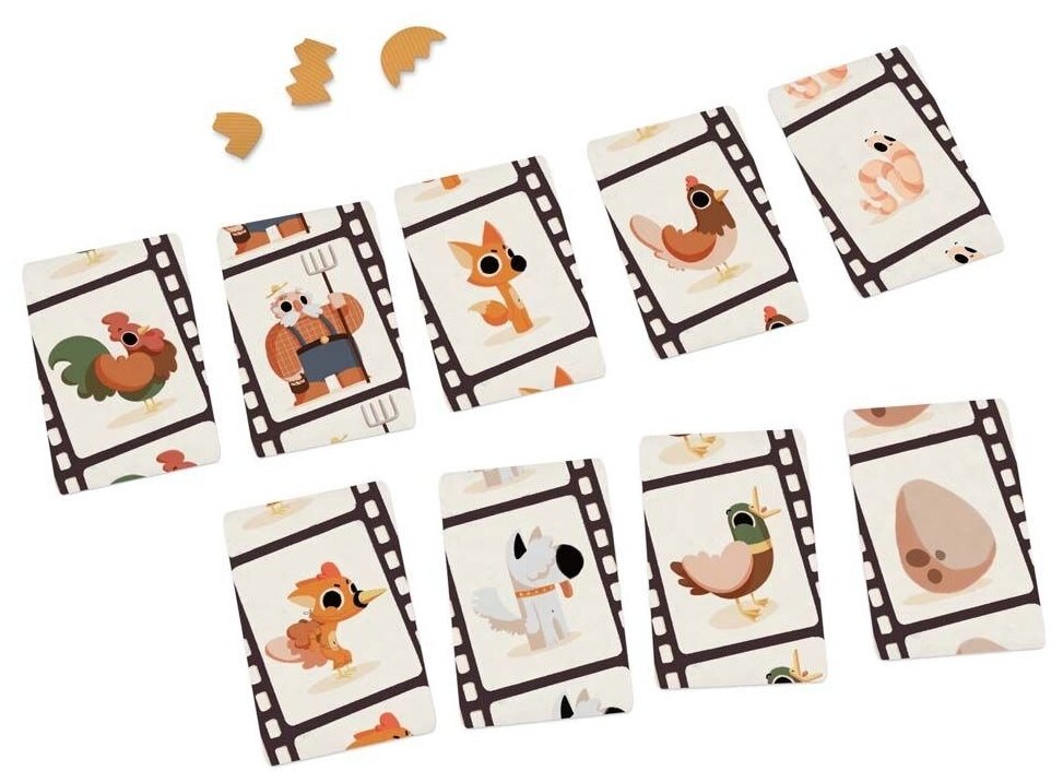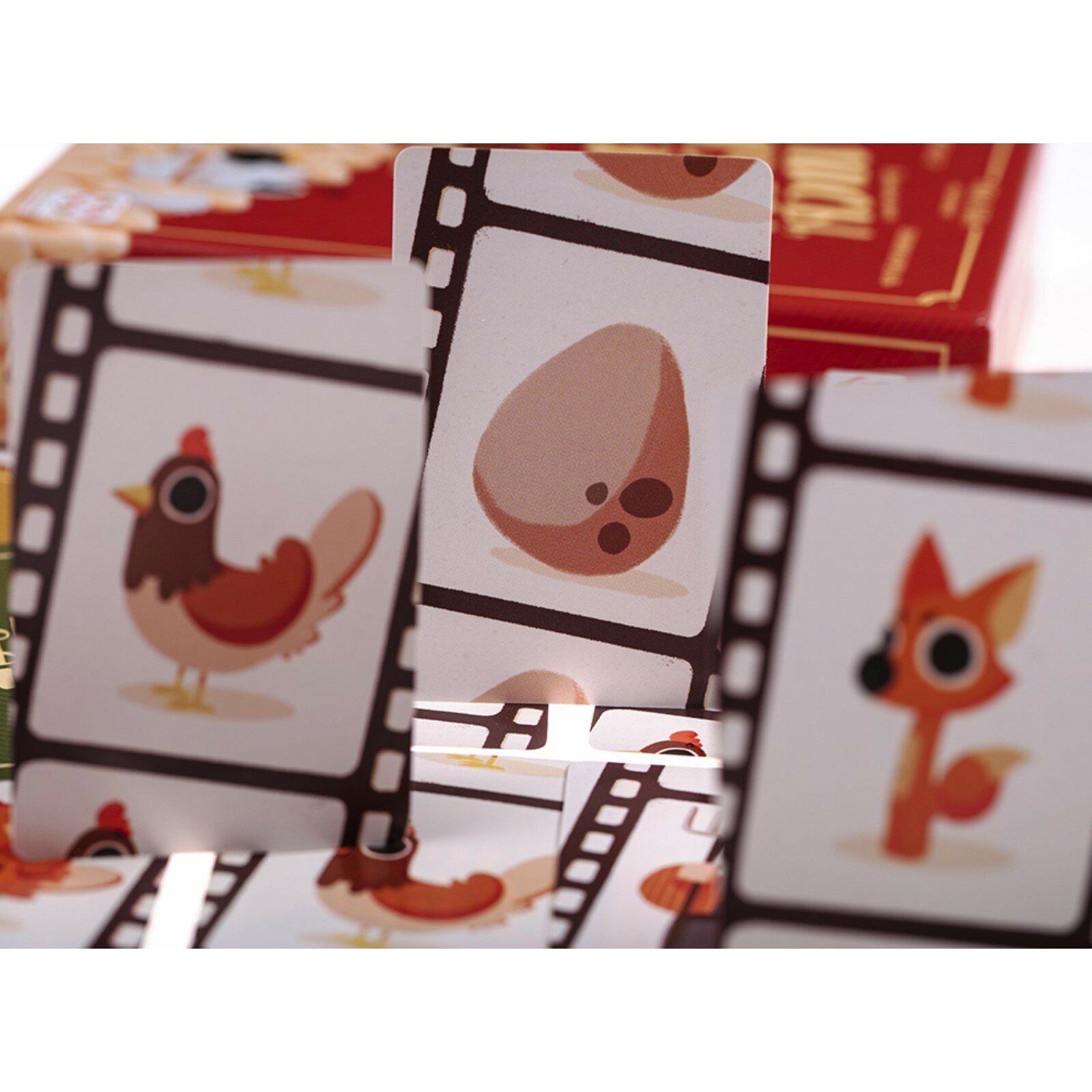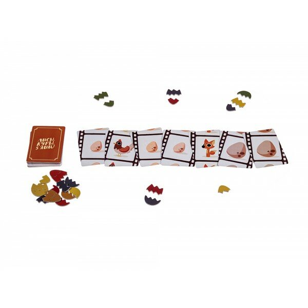 "Лисы, куры, 5 яиц" - это весёлая и динамичная настольная игра на память для любого возраста. Вам предстоит открывать карты и остановиться, когда в появится пятое яйцо. Куриный фестиваль уже близко, и вы спешите снять свой шедевр. События фильма развиваются стремительно, главные герои и второстепенные персонажи сменяют друг друга. Постарайтесь ничего не упустить и закончить фильм в нужный момент. Выбираем режиссёра среди игроков. Именно он будет открывать карты по одной из колоды и класть их друг на друга в центре стола. Открытые карты, таким образом, становятся кадрами фильма. Одновременно с этим все остальные игроки внимательно считают яйца, мелькающие на картах. Помимо яиц, в фильме встречаются курочки, которые садятся на яйца, и их количество соответственно уменьшается. А когда на сцену выходит лис, то он ловит курицу, и та сразу исчезает. Не трудно догадаться, что яйцо при этом снова появляется и становится доступным для подсчёта. В калейдоскопе персонажей важно отследить, когда пять яиц окажутся свободными. Игрок, который заметил это, быстро накрывает стопку рукой. Если он прав, ему присуждается одно победное очко. Тот, кто набрал три очка, становится победителем. Правилами игры предусмотрен режим игры для двух игроков. В этом случае игроки делят колоду между собой и выкладывают карты в стопку по очереди. Став искушёнными кинорежиссёрами, вы можете добавить в фильм второстепенных персонажей. В состав настольной игры входят: 55 карт; 24 жетона очков; правила игры.