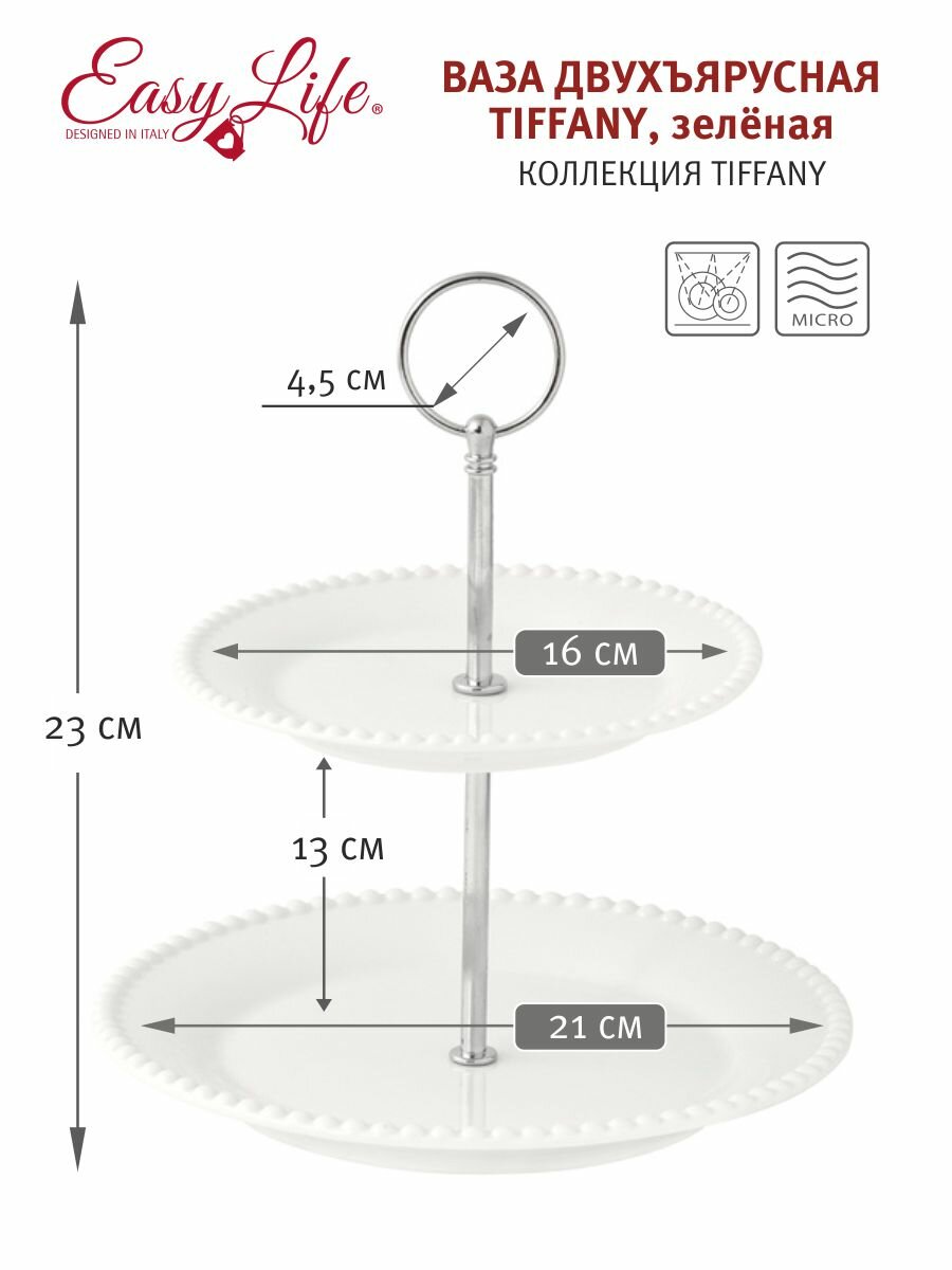 В коллекцию Tiffany от компании Easy Life входят нежные и элегантные блюда, тарелки, салатники, кружки, чашки с блюдцами, а также другая столовая посуда из прочного глазурованного фарфора белоснежного, зеленого, серого, темно-серого, ярко-красного и других приятных оттенков. Предметы имеют простые классические формы и оригинальный дизайн в виде «жемчужин» - округлых шариков глазури, которые будто нанизаны на края изделий и идеально дополняют плавные линии силуэтов. Рельефный декор напоминает безупречные жемчужные ожерелья и олицетворяет собой роскошь, утонченность и изысканный стиль. Посуда Tiffany станет эффектным дополнением повседневной или торжественной сервировки и придаст ей благородный вид. Можно использовать в микроволновой печи и мыть в посудомоечной машине.