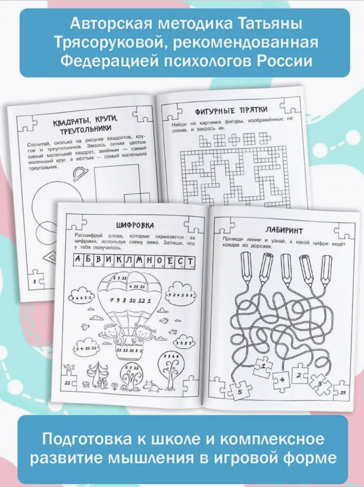 Очень хорошая и полезная тетрадь, много разнообразных заданий разного уровня сложности, есть и для 4-5 лет, и для более старшего возраста ( с переходом через десяток). Забавные иллюстрации, чёрно-белые ( при желании можно раскрасить). Задания на внимание, память, логику, устный счёт. Обложка плотная, глянцевая, листы не просвечивают. Очень рекомендую.