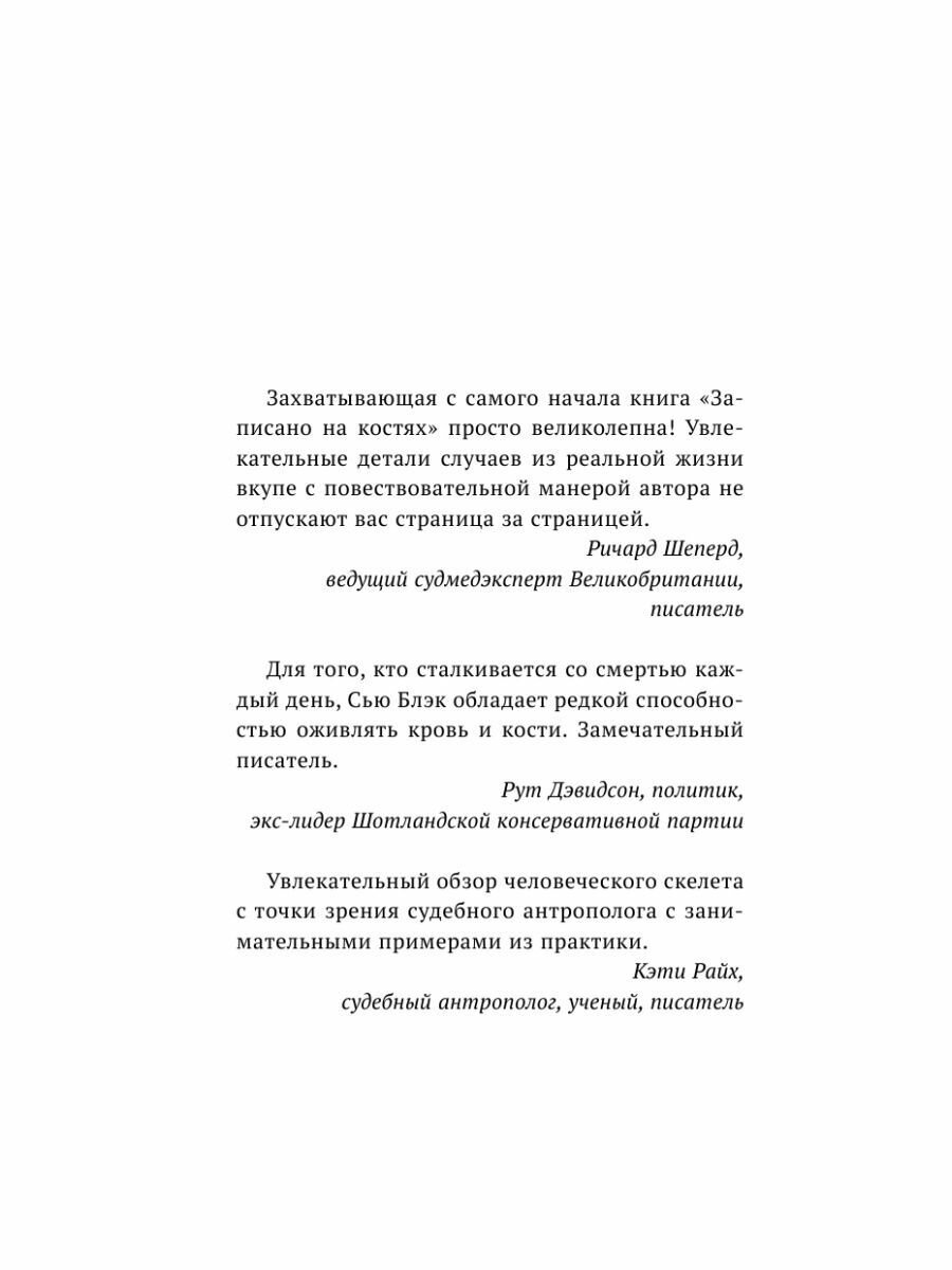 Захватывающая с самого начала книга «Записано на костях» просто великолепна! Увлекательные детали случаев из реальной жизни вкупе с повествовательной манерой автора не отпускают вас страница за страницей, — Ричард Шеперд, ведущий судмедэксперт Великобритании, писатель