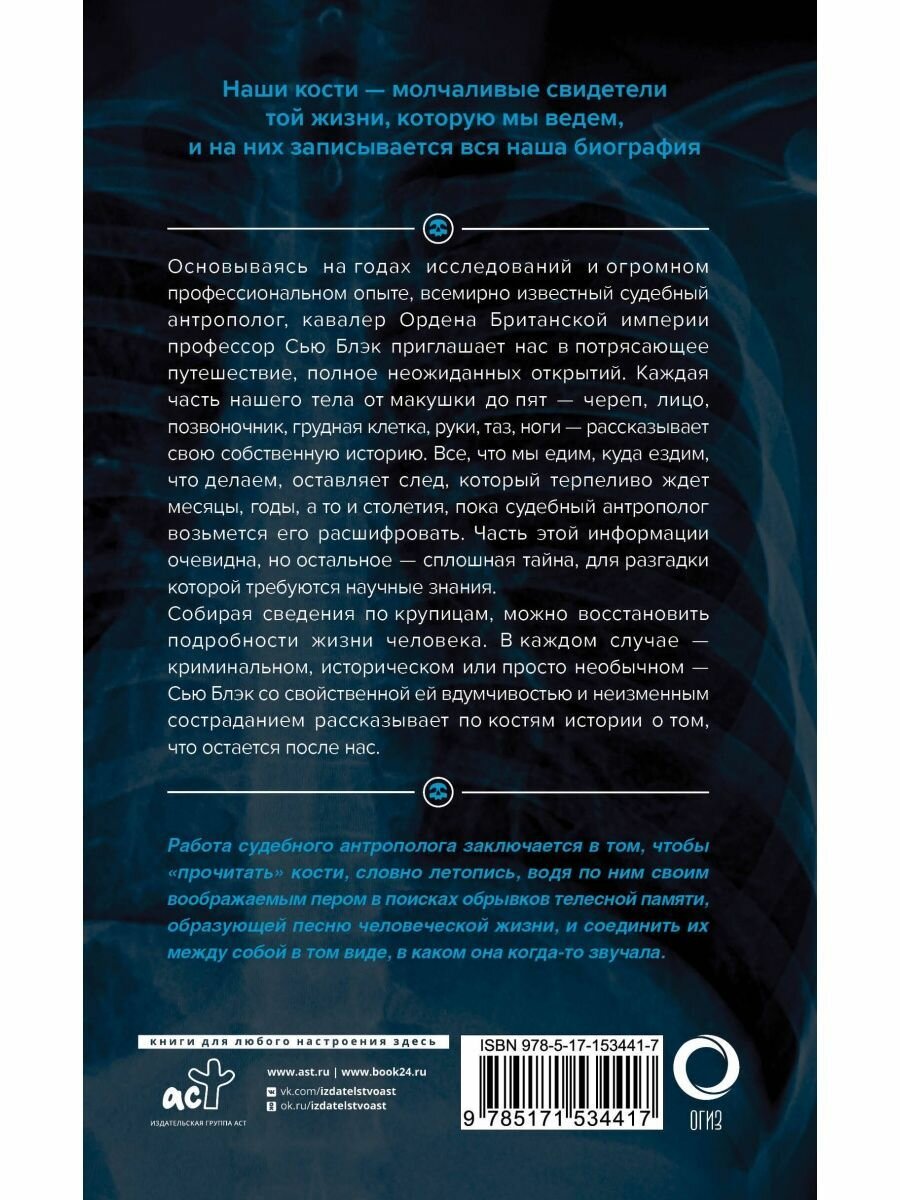Основываясь на годах исследований и огромном профессиональном опыте, всемирно известный судебный антрополог, кавалер Ордена Британской империи профессор Сью Блэк приглашает нас в потрясающее путешествие, полное неожиданных открытий. Каждая часть нашего тела от макушки до пят — череп, лицо, позвоночник, грудная клетка, руки, таз, ноги — рассказывает свою собственную историю. Все, что мы едим, куда ездим, что делаем, оставляет след, который терпеливо ждет месяцы, годы, а то и столетия, пока судебный антрополог возьмется его расшифровать. Часть этой информации очевидна, но остальное — сплошная тайна, для разгадки которой требуются научные знания.