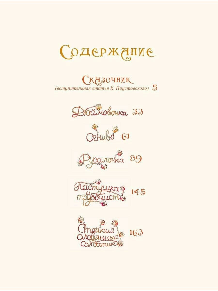 В этом издании все самые известные сказки Андерсена: «Дюймовочка», «Огниво», «Русалочка», «Стойкий оловянный солдатик», «Пастушка и трубочист». Книга обильно иллюстрирована художником Дмитрием Трубиным - это известный иллюстратор, его работы хранятся в музее Пушкина и многих музеях мира. Не уверена, что эти картинки понравятся детям, но как предмет коллекционирования издание отличное! Особенно приятно, что странички с текстом тоже украшены – рамочками, завитушками.
