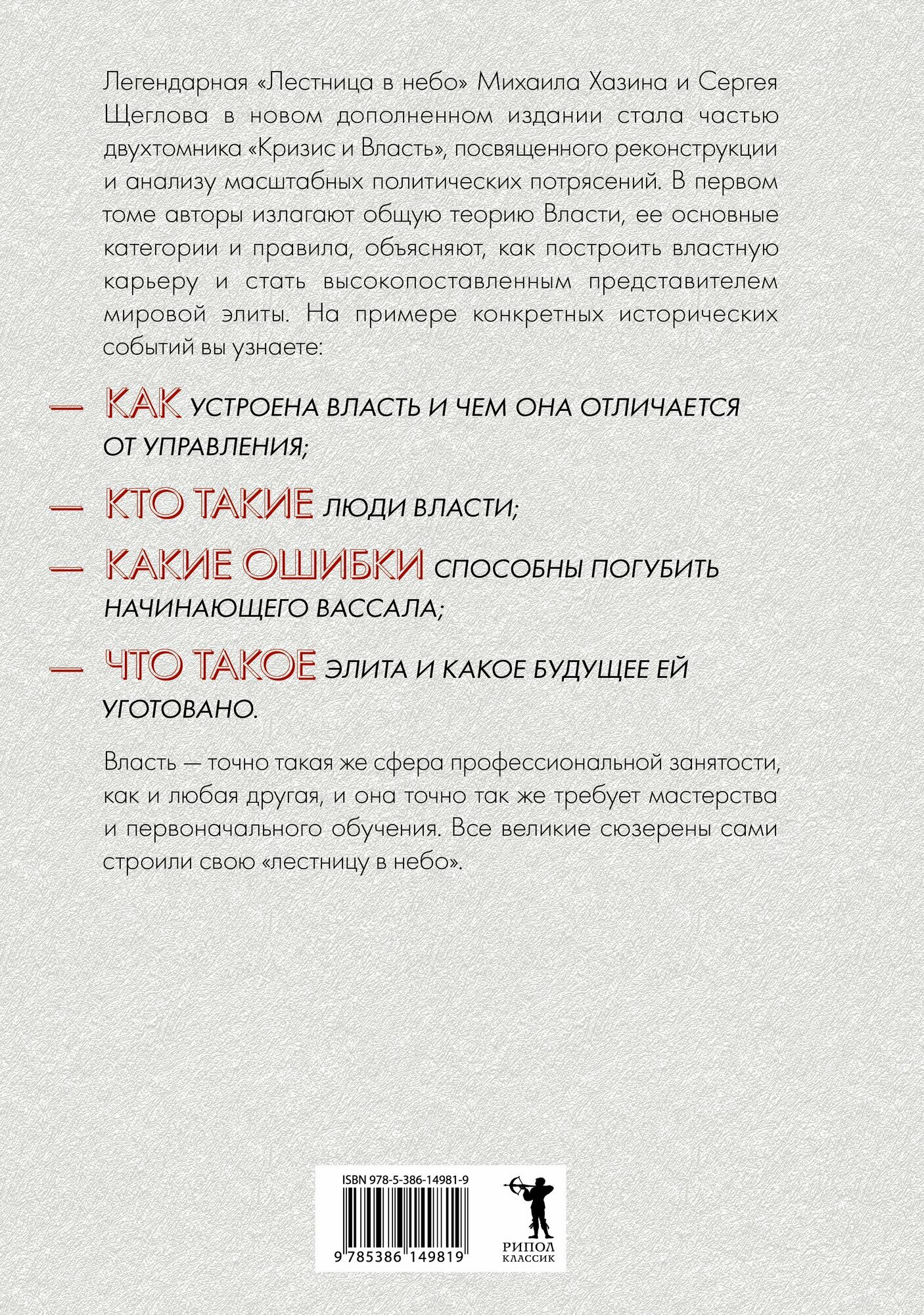 В новом дополненном издании "Лестницы в небо" Михаил Хазин и Сергей Щеглов излагают общую теорию Власти и подробно рассказывают обо всех стадиях властной карьеры - от рядового сотрудника корпорации до высокопоставленного представителя мировой элиты.