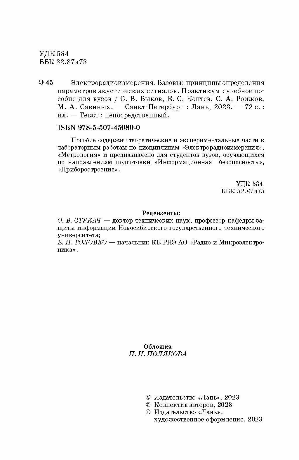 Электрорадиоизмерения. Базовые принципы определения параметров акустических сигналов. Практикум. Учебное пособие для вузов (Быков Сергей Владимирович, Рожков Семен Андреевич, Савиных Максим Александрович); Лань, 2023