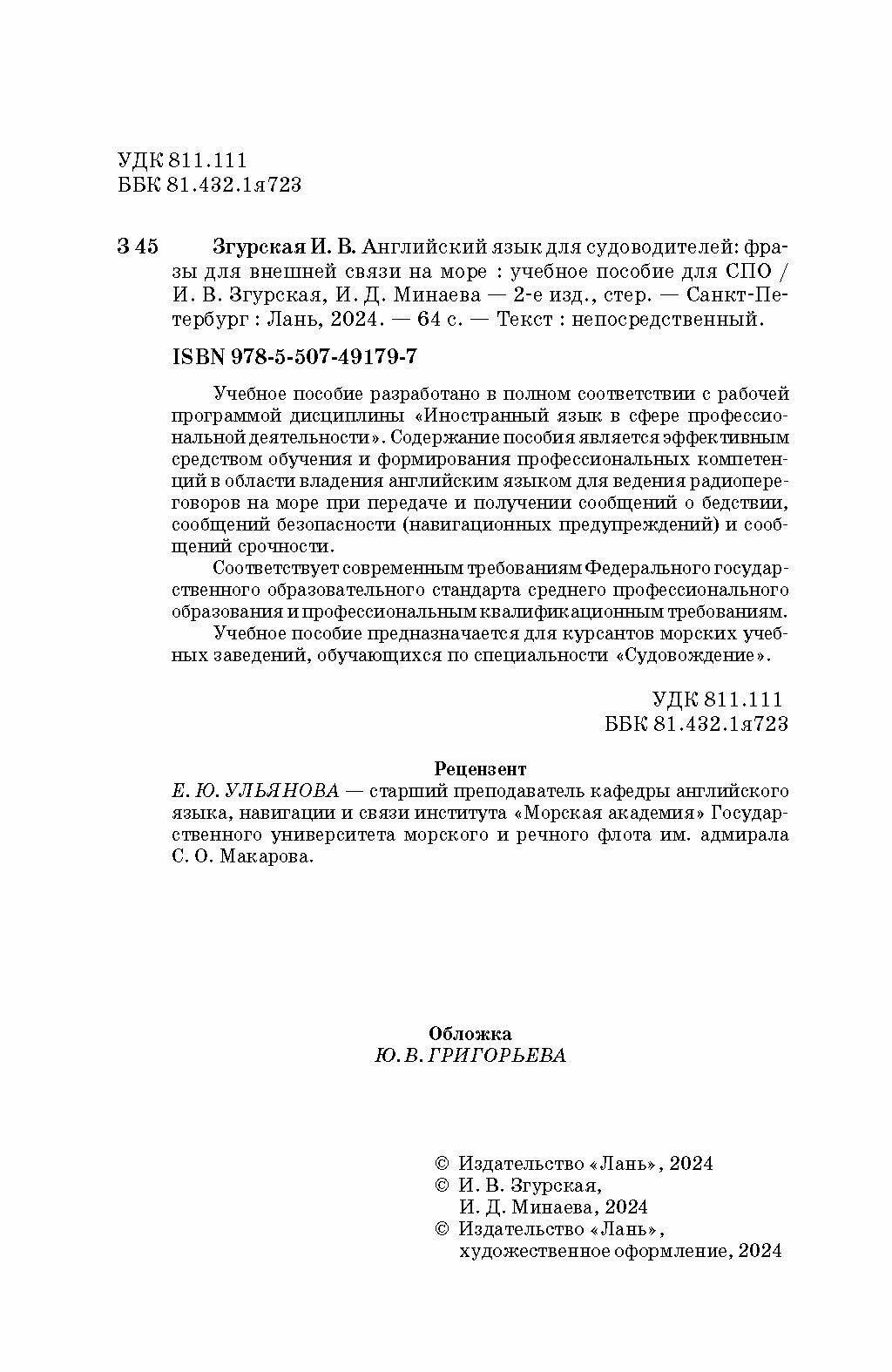 Английский язык для судоводителей: фразы для внешней связи на море. Учебное пособие для СПО (Згурская Ирина Владимировна, Минаева Ирина Дмитриевна); Лань, 2023