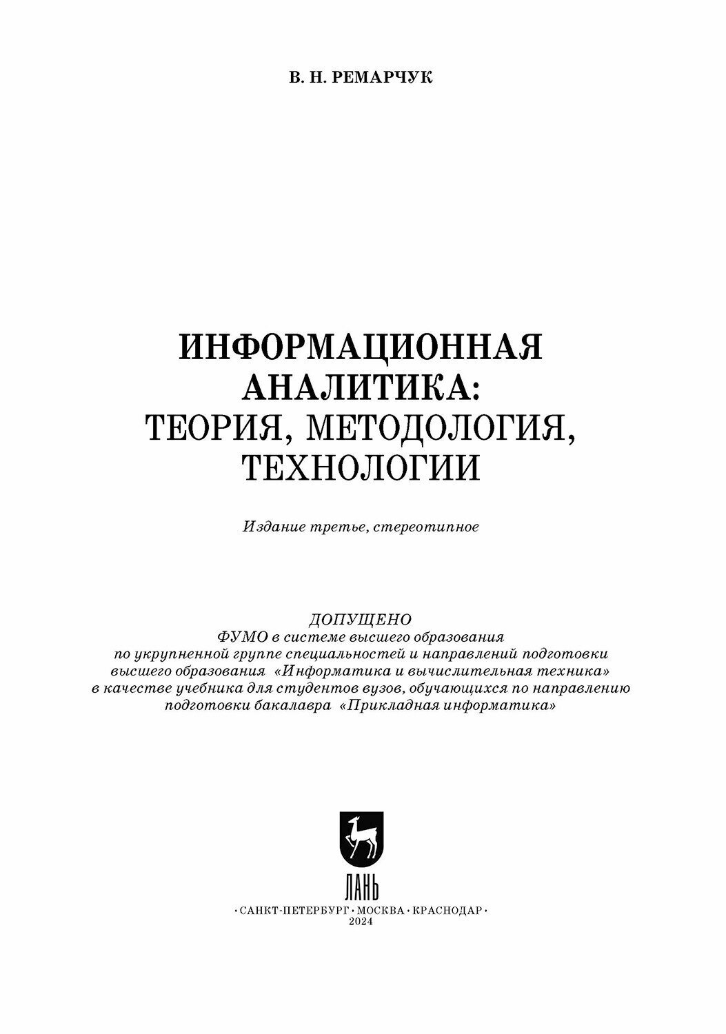 Информационная аналитика. Теория методология технологии. Учебник для вузов (Ремарчук Валерий Николаевич); Лань, 2023