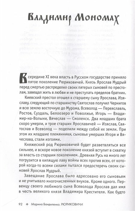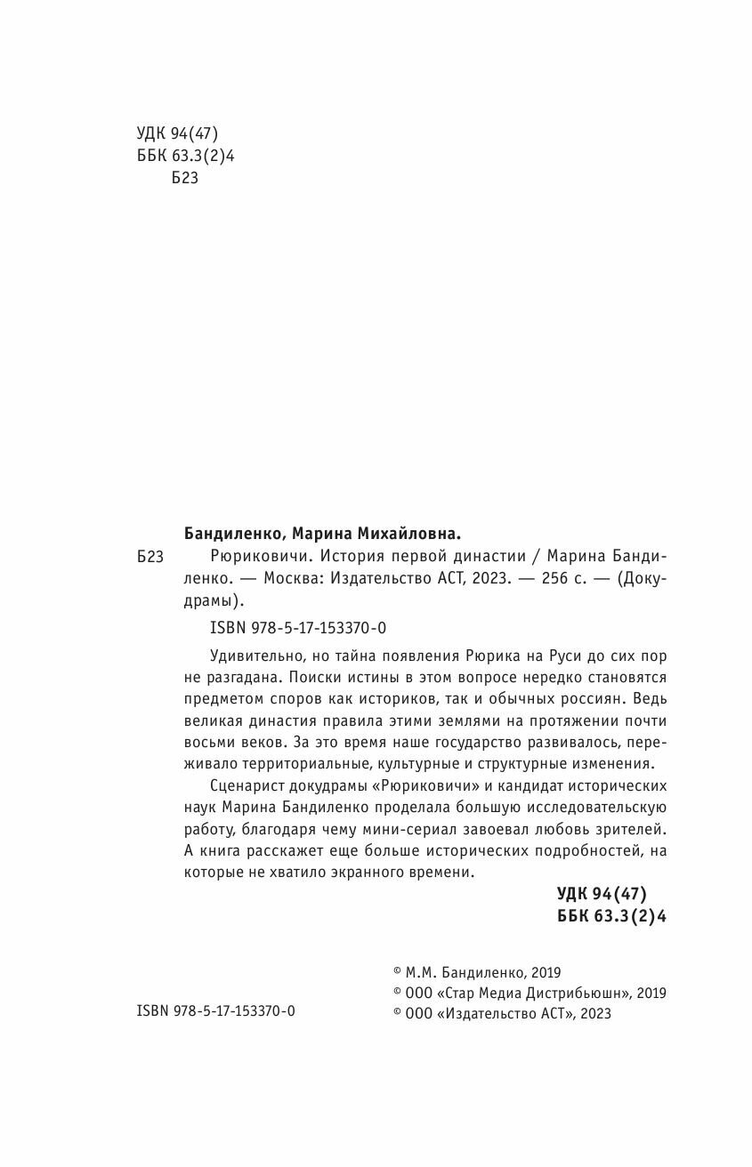 Прочитал несколько страниц. Ведь это исторический ужас. Династии "Рюриковичи" никогда не существовало. Иоанн "Грозный" - Рурик. У этой династии всего три поколения - отец, сын, внук и внучка. Про какие тысячелетия идёт речь ?! Возможно, что - "Рурики" даже не имя династии, а персональное прозвище Иоанна. На территории от Балтики до Волги на востоке никогда не проживали "славянские племена". Скявониа, с конца 16 века - Славониа, чуть позже - Славениа. Так это Адриатическое побережье и Булгары. Термин "славяне" - фальсификат 19 века. Автор, как и вся академическая наука, не знает 18 век, но полезла в абстрактное прошлое. Книгу можно смело отнести в раздел небылицы. Уже нет тайны "появления Рюрика на Руси", как и многих других тайн нашей земли, Европы и Асии. А сказки таких писателей можно обвалить всего шестью строчками. Марина Бандиленко – кандидат исторических наук, а также сценарист докудрамы «Рюриковичи. История первой династии». Послушайте, академическая наука до сих пор не знает и не понимает этимологию имени "Русь", но трудов написано этими клоунами предостаточно. Исторический вакуум забивают литературой типа этой.