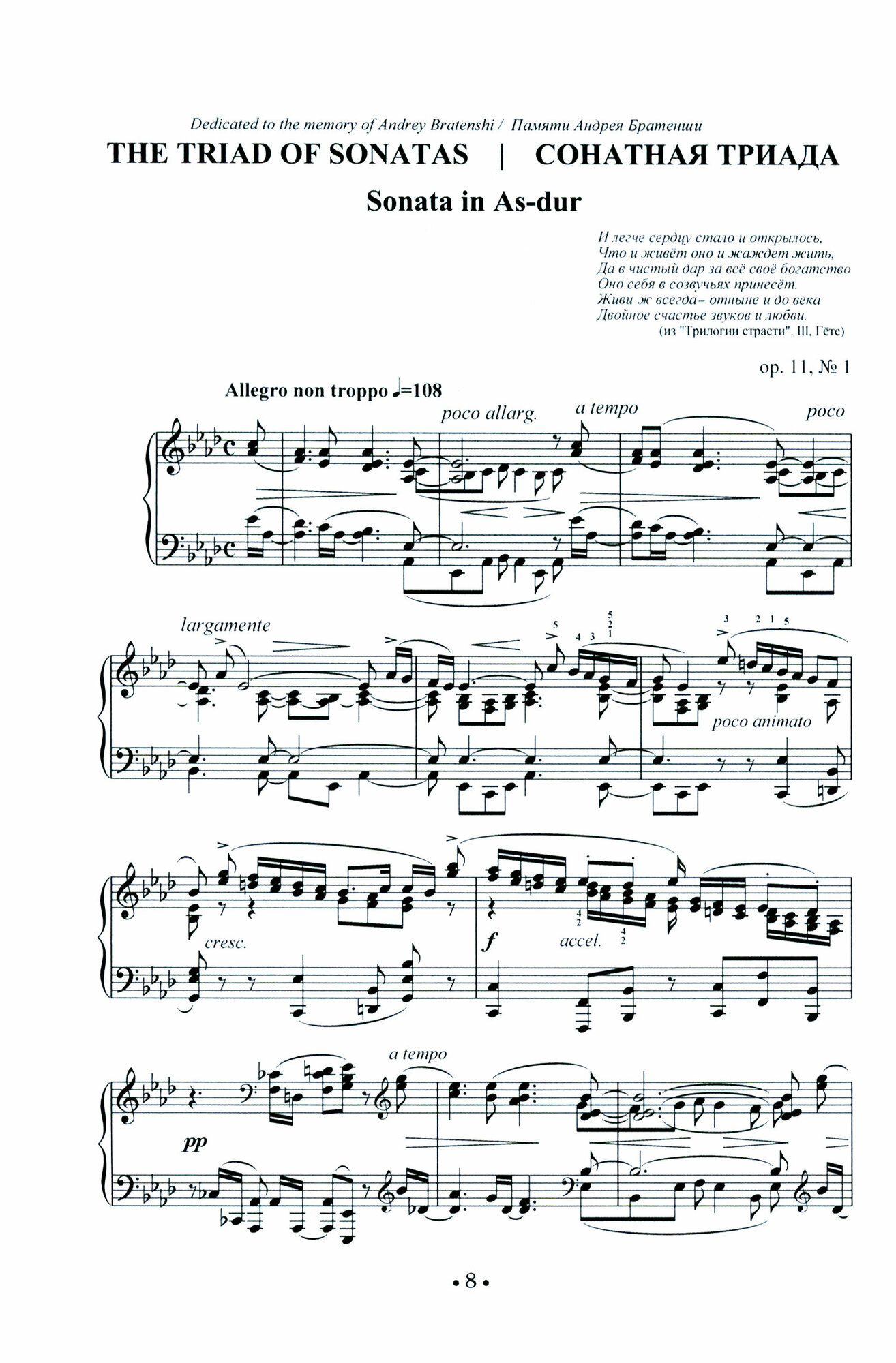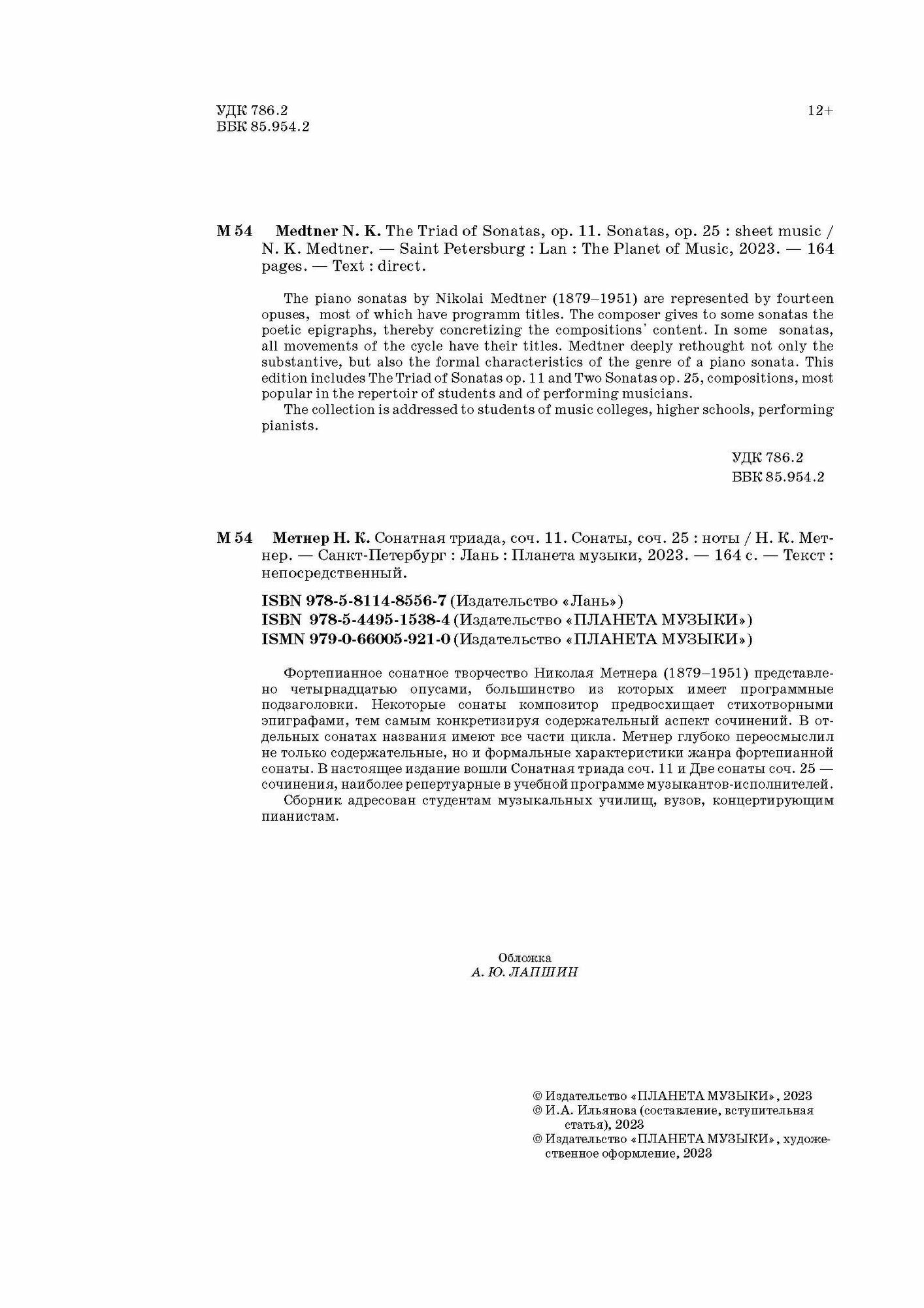 Сонатное творчество Метнера представлено четырнадцатью опусами, большинство из которых имеет программные подзаголовки. Некоторые сонаты композитор предвосхищает стихотворными эпиграфами, тем самым конкретизируя содержательный аспект сочинений. В отдельных сонатах названия имеют все части цикла. Метнер глубоко переосмыслил не только содержательные, но и формальные характеристики жанра. В настоящее издание вошли "Сонатная триада соч. 11" и "Две сонаты соч. 25" - сочинения, наиболее репертуарные в учебной программе музыкантов-исполнителей. Сборник адресован студентам музыкальных училищ, ВУЗов, концертирующим пианистам.