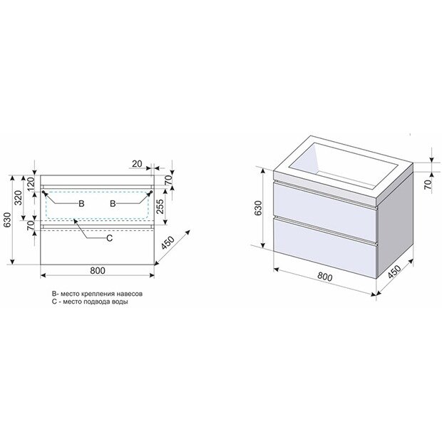 - Количество ящиков: 2. Верхний ящик с вырезом под сифон.