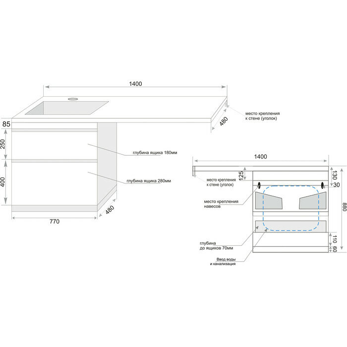 | Материал раковины | С раковиной из искусственного камня (литьевого мрамора) |