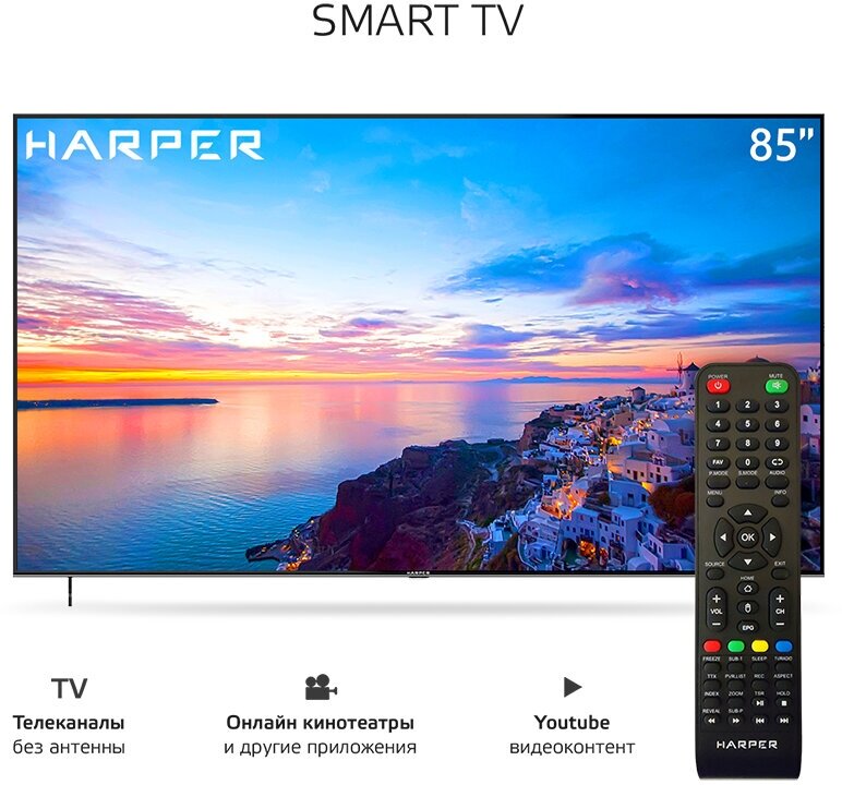 Наслаждайтесь просмотром любимых программ и фильмов в разрешении 4K Ultra HD с LED телевизор Harper 85U750TS. Большой 85 - дюймовый экран c тонкими рамками, обладающий широкими углами обзора и разрешением 3840х2160, обеспечивает максимально четкое, яркое и насыщенное изображение.